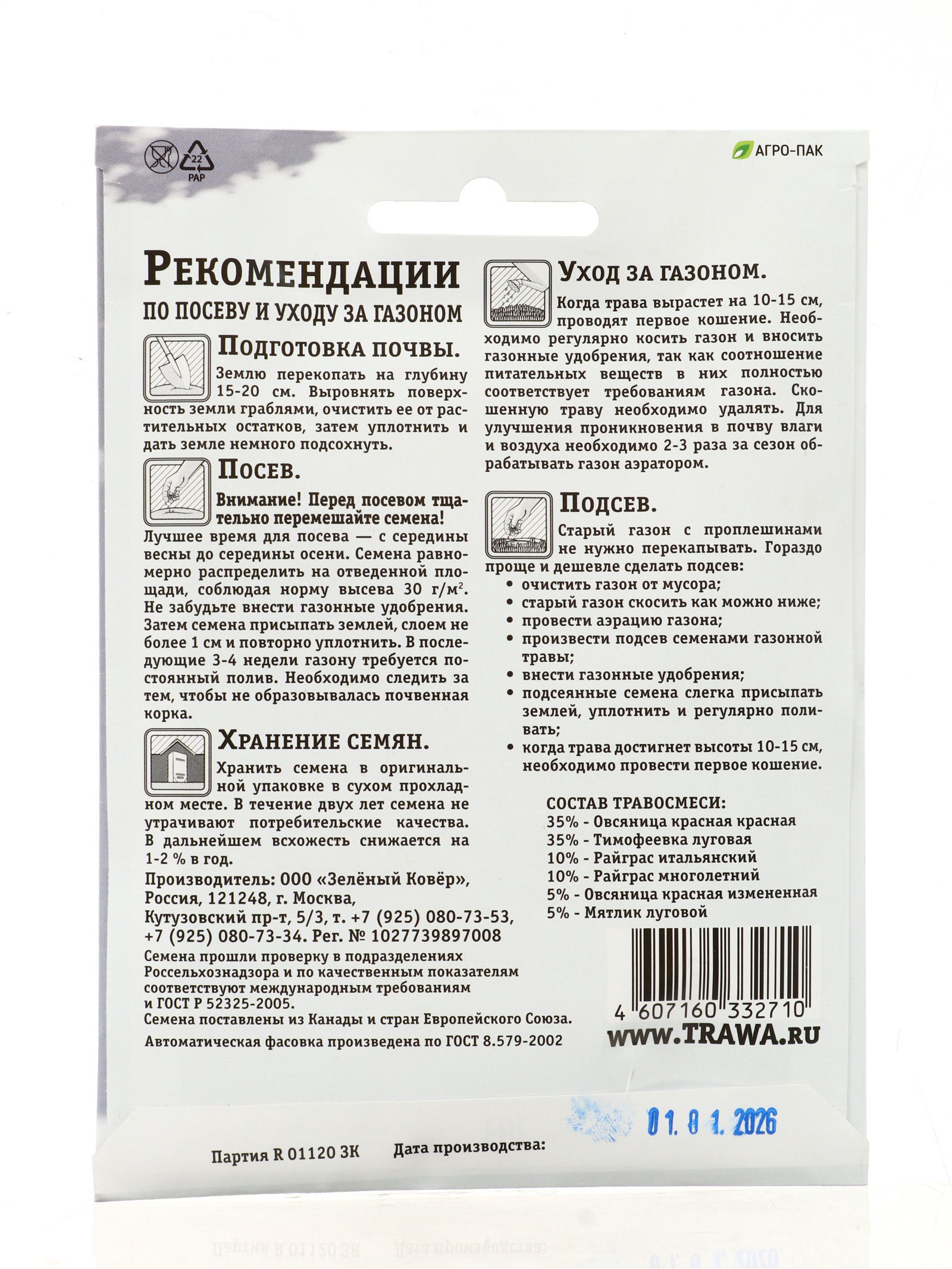 Посев (посадка) в грунт: Август, Июль, Июнь, Май, Сентябрь Состав газонных трав: Овсяница красная, Тимофеевка луговая Размер упаковки: 11 x 0.5 x 15 см. tnved: 1209999900 Температурное ограничение: Нет Место выращивания: Открытый грунт Площадь, ?2: 1 Вес/Объём: 30 г Особенности газона: Теневыносливый Теневая газонная смесь «Зеленый квадрат» - это компактное решение для создания красивого, густого газона в затененных местах. Состав из овсяницы красной и тимофеевки луговой формирует плотный травяной ковер, который отлично растет в условиях недостаточного освещения. Упаковки 30 г достаточно для засева 1 м².