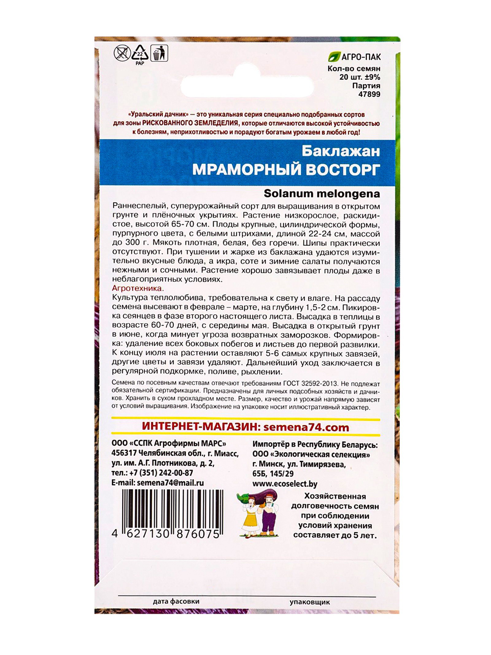 Семена Баклажан "Мраморный Восторг", 20 шт., Уральский Дачник, Россия