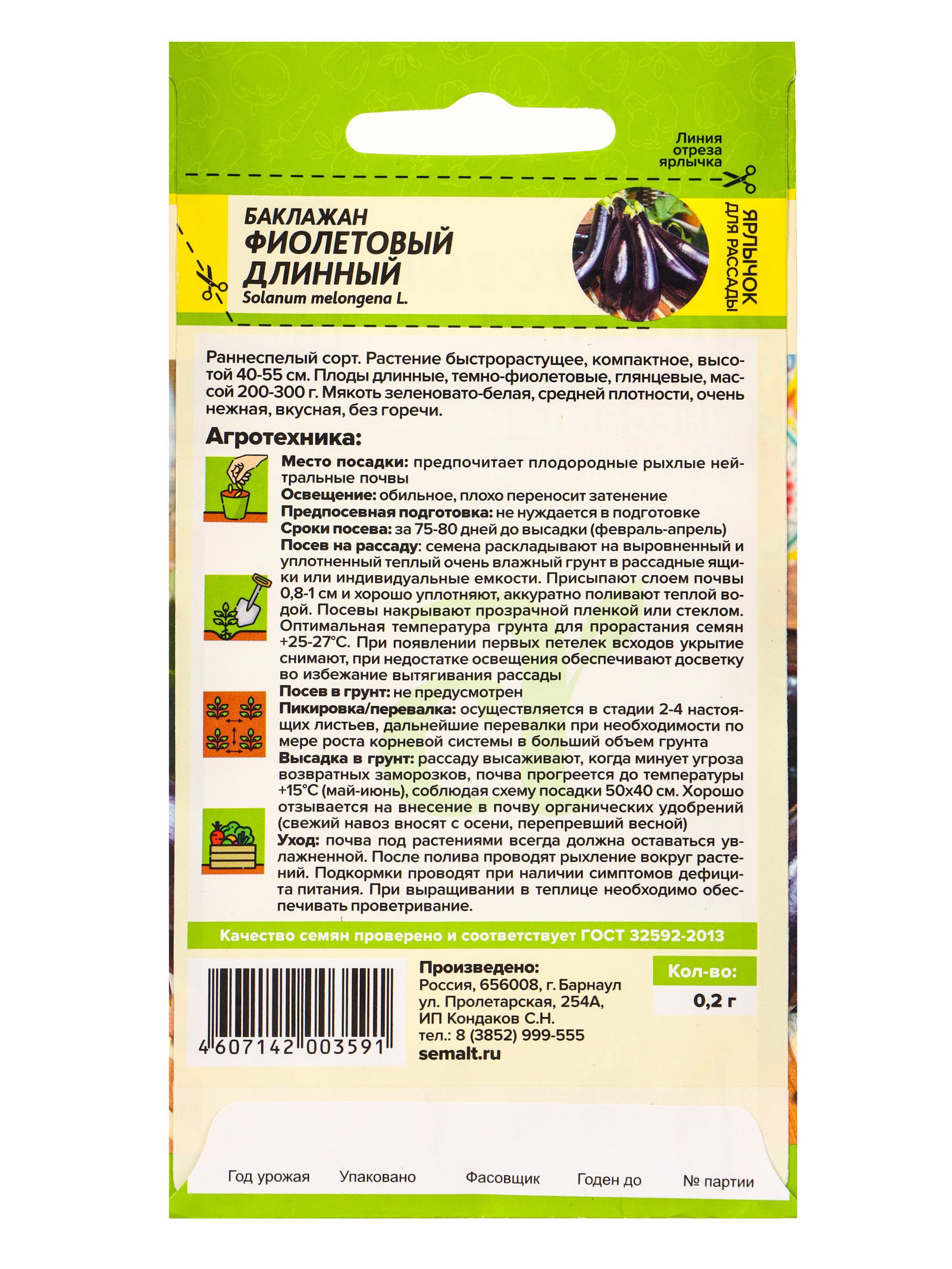 Посев на рассаду: Март, Февраль Посев (посадка) в грунт: Июнь, Май Размер упаковки: 15 x 0.3 x 8 см. Цвет плода: Тёмно-фиолетовый Вид: Простые семена Количество семян, г: 0.2 tnved: 1209918000 Сроки созревания: Ранний Упаковка: Цветная Сорт или гибрид: Сорт Вегетационный период, дни: [90,100] Место выращивания: Универсальный Раннеспелый сорт. Растение быстрорастущее, компактное, высотой 40-55 см Плоды длинные, темно-фиолетовые, глянцевые, массой 200-300 гр Мякоть зеленовато-белая, средней плотности, очень нежная, вкусная, без горечи. Свето- и теплолюбивое растение. Предпочитает плодородные, хорошо дренированные почвы с нейтральной реакцией среды. Кислые почвы необходимо известковать. Культуру следует размещать на хорошо освещенных, защищенных от ветра участках. Посев семян на рассаду производят в конце февраля первой половине марта в горшочки диаметром до 8 см, на глубину 1-1,5 см Оптимальная температура для прорастания семян +20-24℃, рекомендуется досветка фитолампами. Рассаду высаживают в теплицу или под пленочное укрытие в мае, соблюдая схему посадки 50х40 см Температура почвы должна быть выше 14℃. Хорошие предшественники: огурцы, капуста, бобовые. Дальнейший уход заключается в умеренных поливах и подкормках минеральными удобрениями. Первая подкормка – через 10-15 дней после высадки рассады, вторая – в начале плодообразования. Рекомендуемые удобрения: перегной 3-4 кг/кв.м, комплексное минеральное удобрение с небольшим количеством азота и равным содержанием фосфора и калия в количестве 15 г/кв.м. | ||