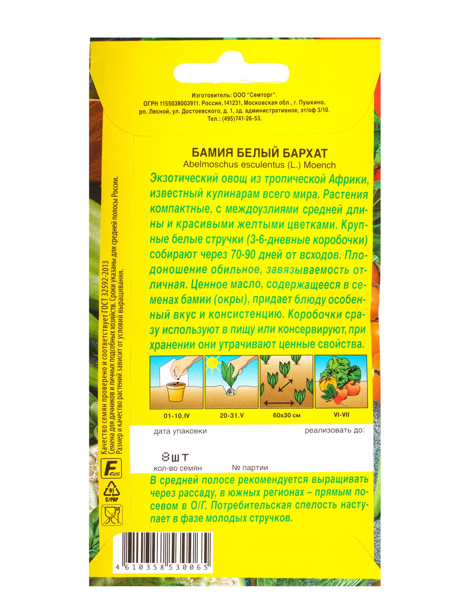 Семена Бамия Белый бархат Семторг, Ц/П СТ,8 шт., Агрофирма АЭЛИТА, Россия