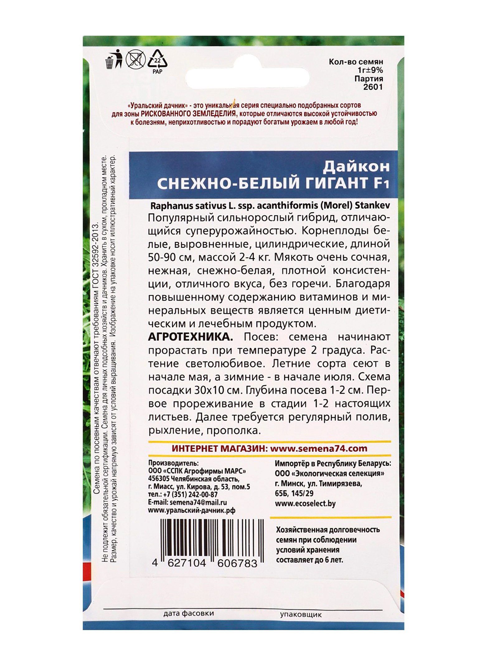 Посев (посадка) в грунт: Июль, Март Размер упаковки: 8 x 0.3 x 15 см. Сроки созревания: Средний Сорт или гибрид: Сорт Место выращивания: Открытый грунт Форма: Остро-коническая Упаковка: Цветная Вид: Горошины tnved: 1209918000 Популярный, сильнорослый гибрид, отличающийся суперурожайностью. Корнеплоды белые, выровненные, цилиндрические, длиной 50-90 см, массой 2-4 кг Мякоть очень сочная, нежная, снежно-белая, плотной консистенции, отличного вкуса, без горечи. Благодаря повышенному содержанию витаминов и минеральных веществ, является ценным диетическим и лечебным продуктом. | ||