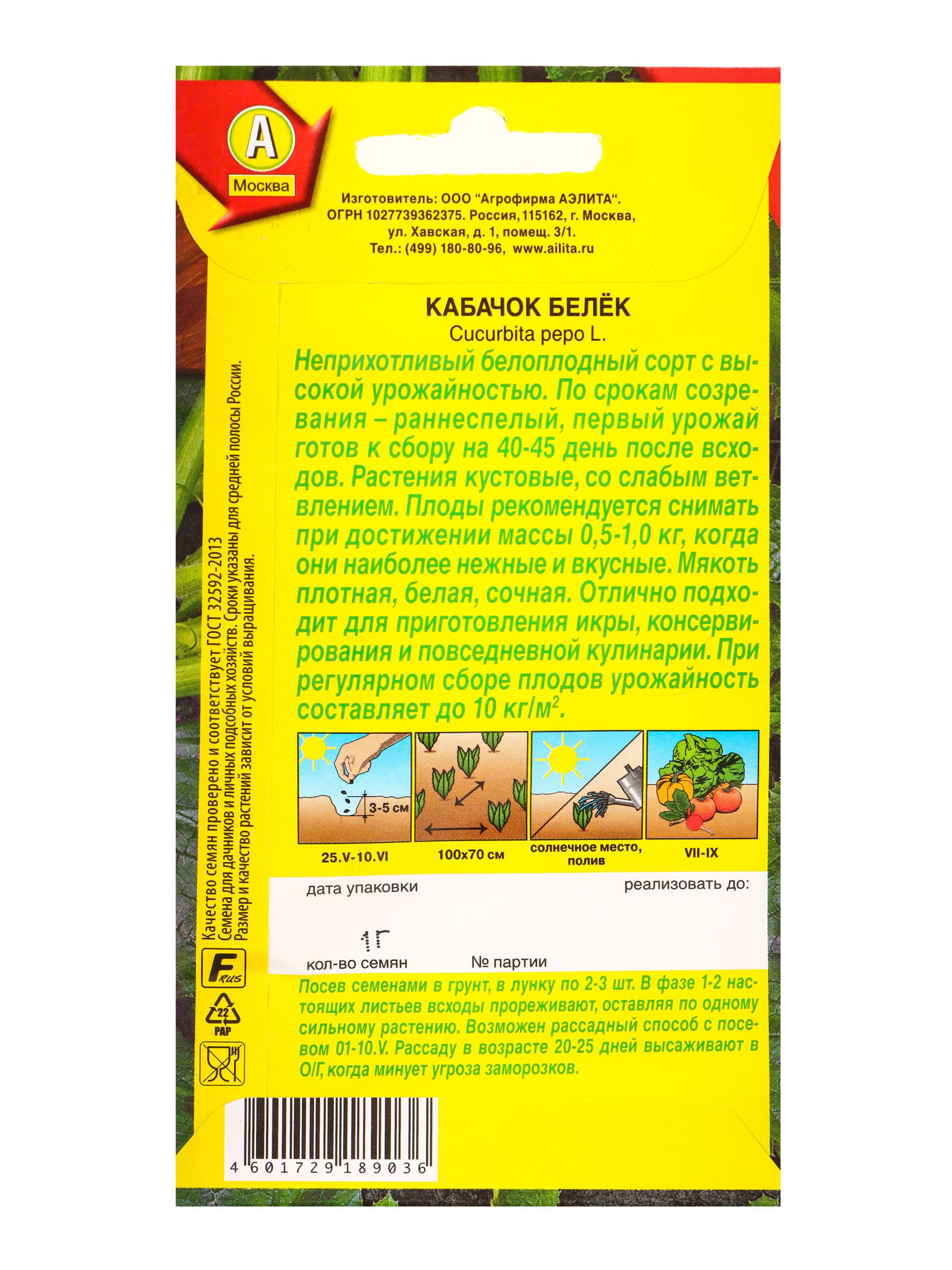 Семена Кабачок белоплый Белёк, Ц/П,1 г, Агрофирма АЭЛИТА, Россия