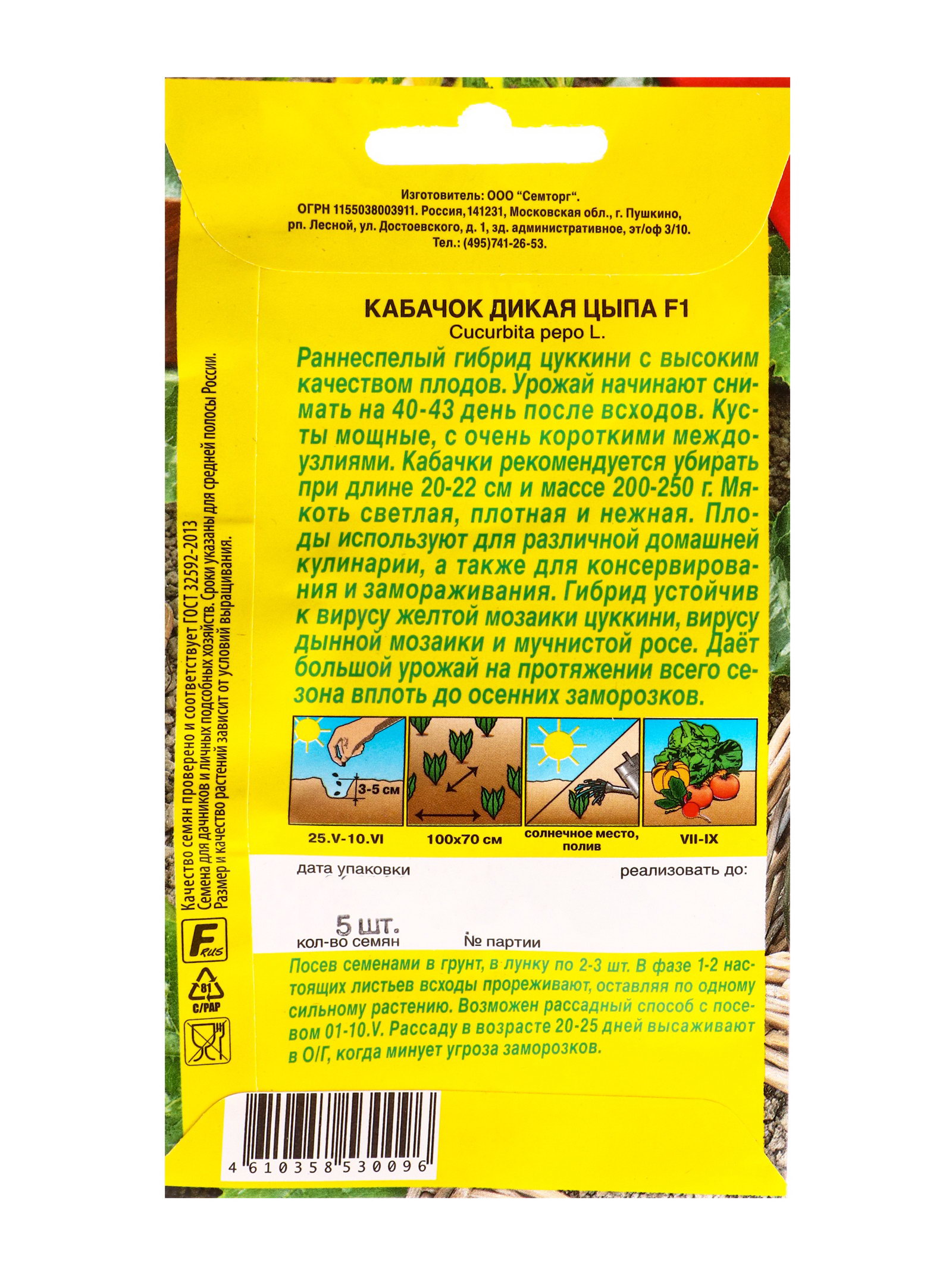 Семена Кабачок цуккини Дикая цыпа F1 Семторг, Ц/П СТ,5 шт., Агрофирма АЭЛИТА, Россия