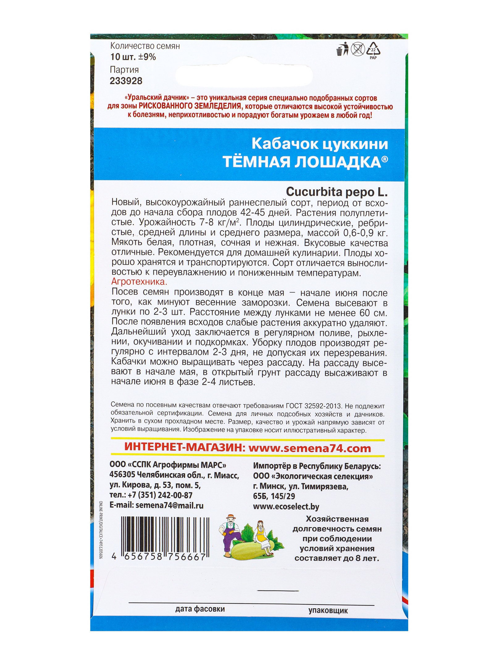 Семена Кабачок Тёмная лошадка - цукини, Уральский Дачник, Россия