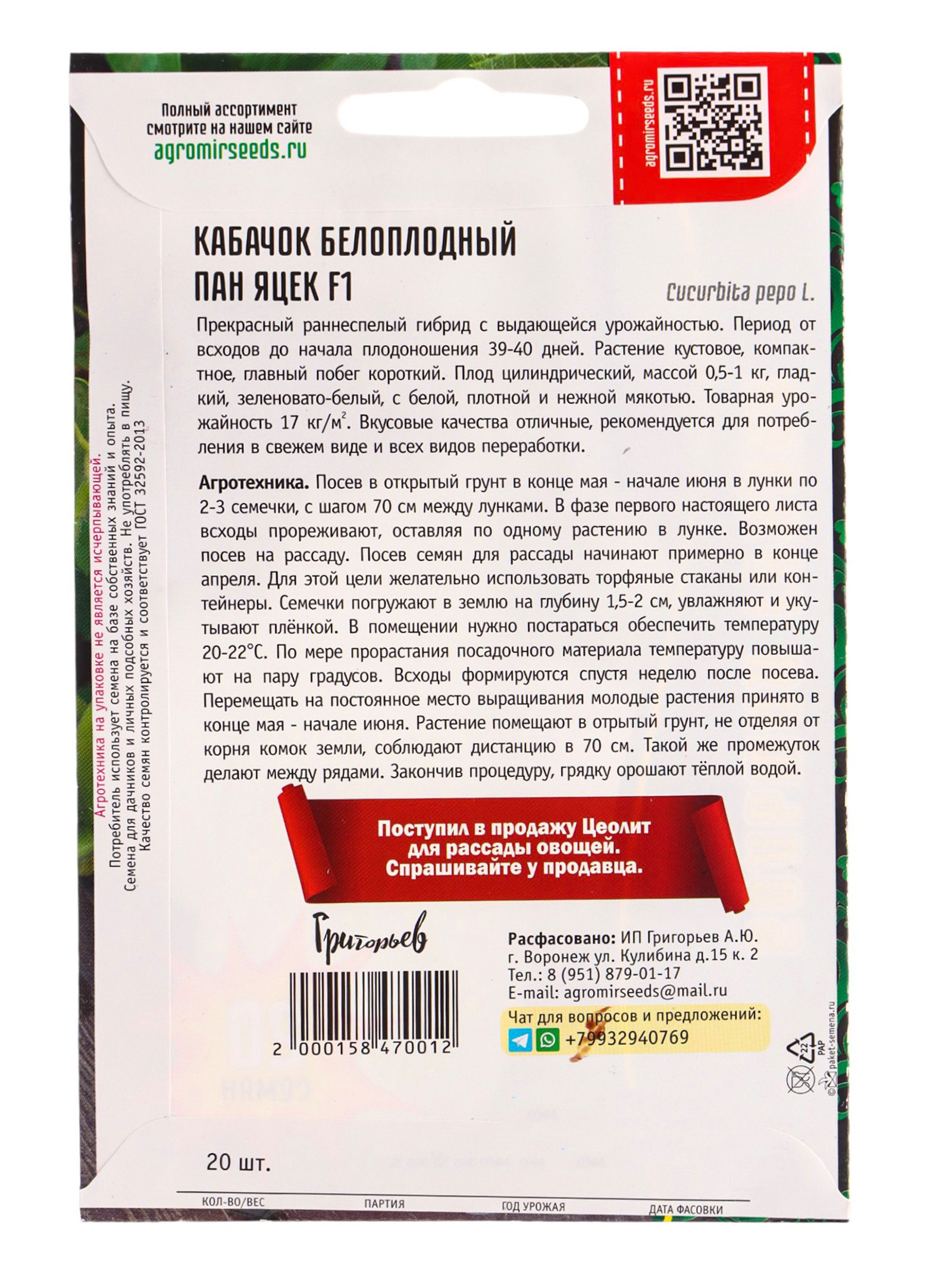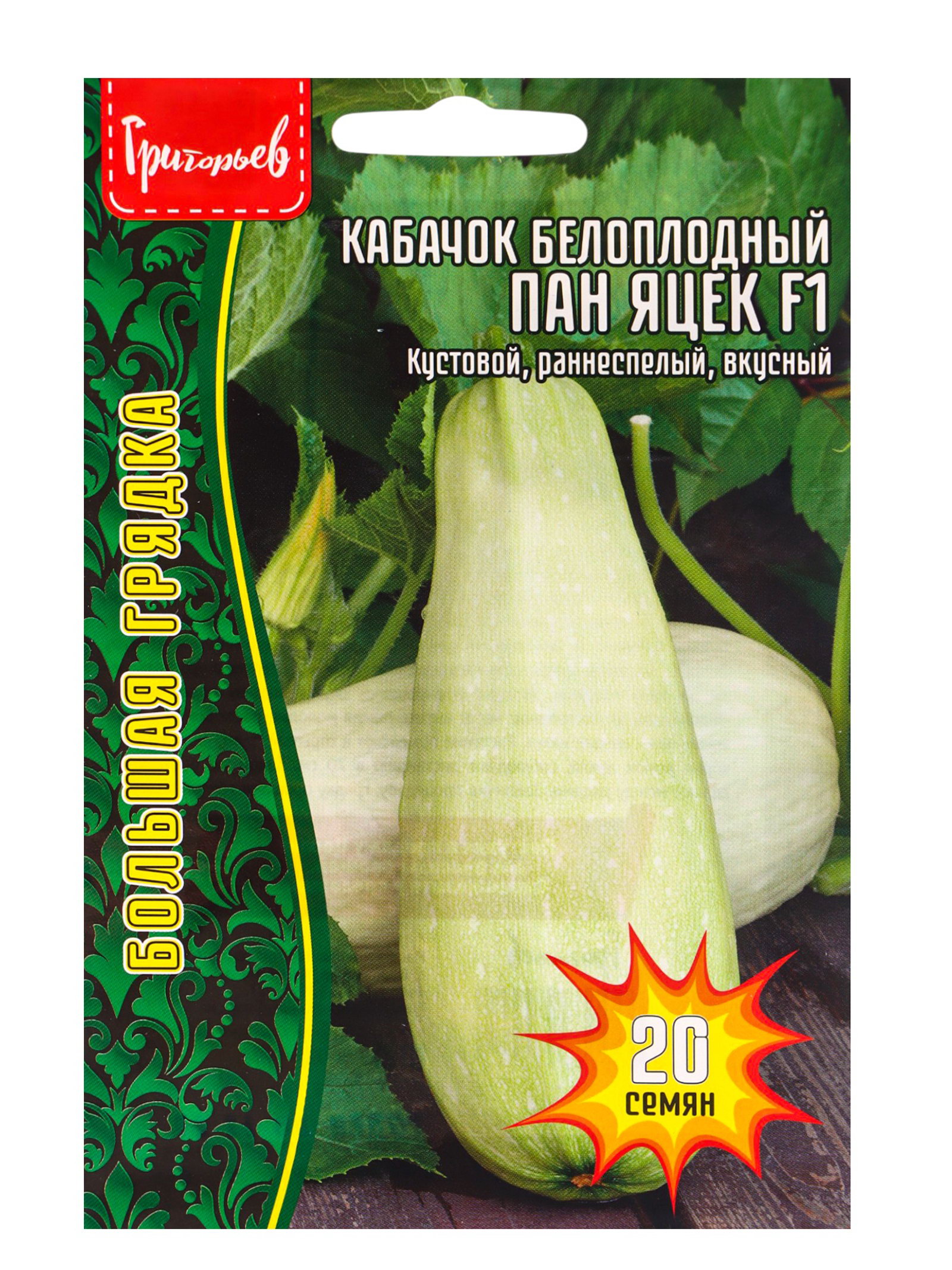 Семена цветов Кабачок белоплодный Пан Яцек F1 20 шт. 12.29 гр, Григорьев, Россия