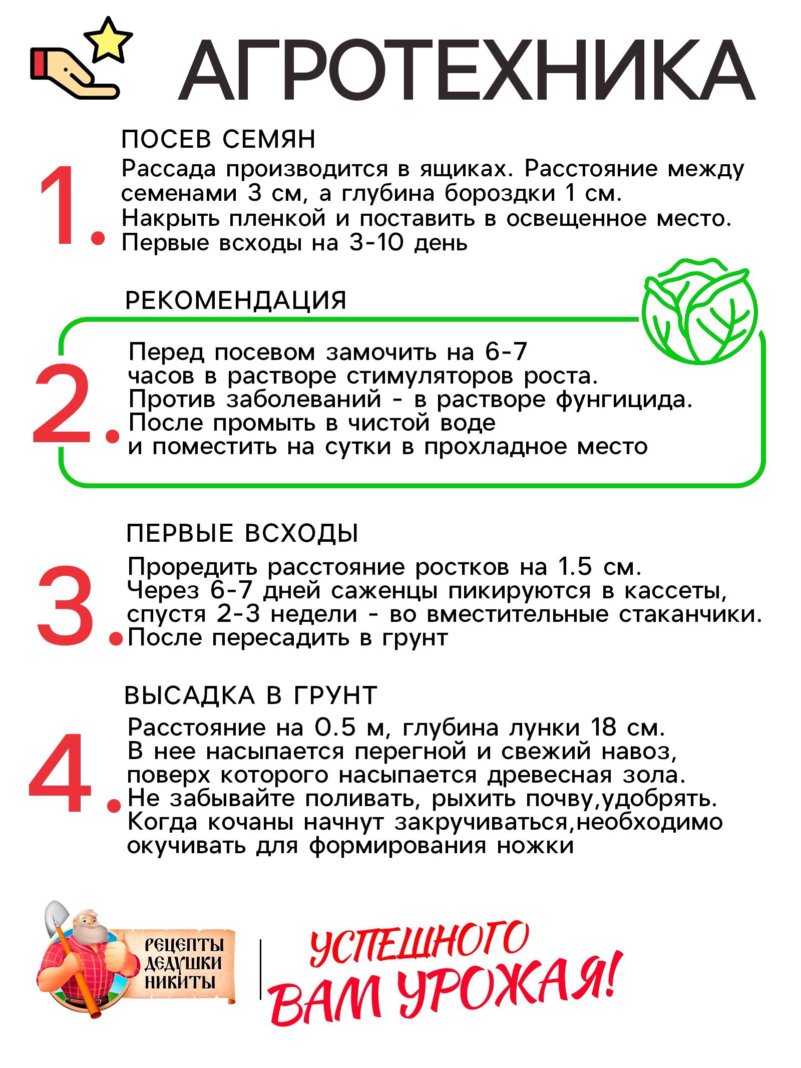 Посев (посадка) в грунт: Июнь, Май Посев на рассаду: Апрель, Март Размер упаковки: 8 x 0.1 x 15 см. Сорт или гибрид: Сорт Вид капусты: Белокачанная Сроки созревания: Средний Агрономический срок годности, лет: 5 Температурное ограничение: Нет Особенности выращивания: Открытый грунт Упаковка: Цветная Применение: Универсальное Вид: Горошины tnved: 1209918000 tnved: 1209918000 Семена Капусты белокочанной "Слава 1305", 0,5 г Капуста белокочанная "Слава 1305" это один из самых известных и популярных сортов, который отличается высокой урожайностью и отличными вкусовыми качествами. Этот сорт прекрасно подходит для выращивания как в открытом грунте, так и в теплицах, радуя вас вкусными и сочными кочанами. Размер или масса плода: Кочаны крупные, весом 2-4 кг, плотные и тяжелые, что делает их идеальными для хранения и переработки. Срок созревания: Среднеспелый сорт, созревает за 110-120 дней от момента высадки семян. Урожайность: Высокая, до 8-10 кг с квадратного метра, что позволяет получать обильный урожай даже на небольших участках. Цвет: Светло-зеленый с характерным белым оттенком внутри, кочаны выглядят очень привлекательно на столе. Вкус: Сладкий и нежный, с легкой хрустящей текстурой, что делает капусту "Слава 1305" отличным выбором для салатов и квашения. Форма: Кочаны округлой формы, плотные и компактные, что облегчает их хранение и транспортировку. Тип роста: Растения среднерослые, с мощной корневой системой, что обеспечивает им хорошую устойчивость к неблагоприятным условиям. Особенности выращивания: Тип грунта: Подходит для открытого грунта. Рекомендуется выращивать на хорошо удобренных и рыхлых почвах для достижения максимального урожая. Агротехника и советы при посеве