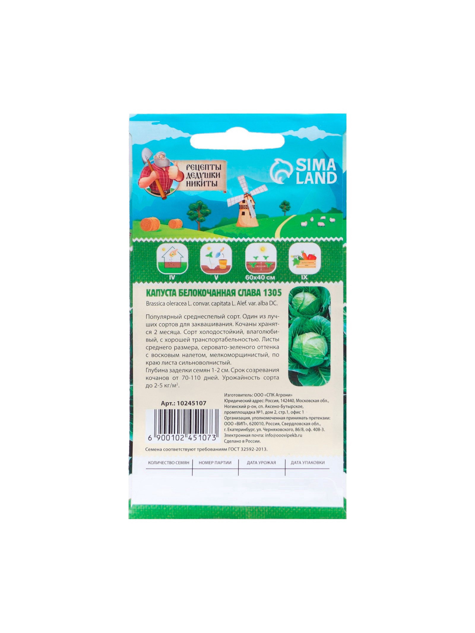 Семена Капуста белокочанная "Слава 1305", 0.5 г, Рецепты дедушки Никиты, Россия