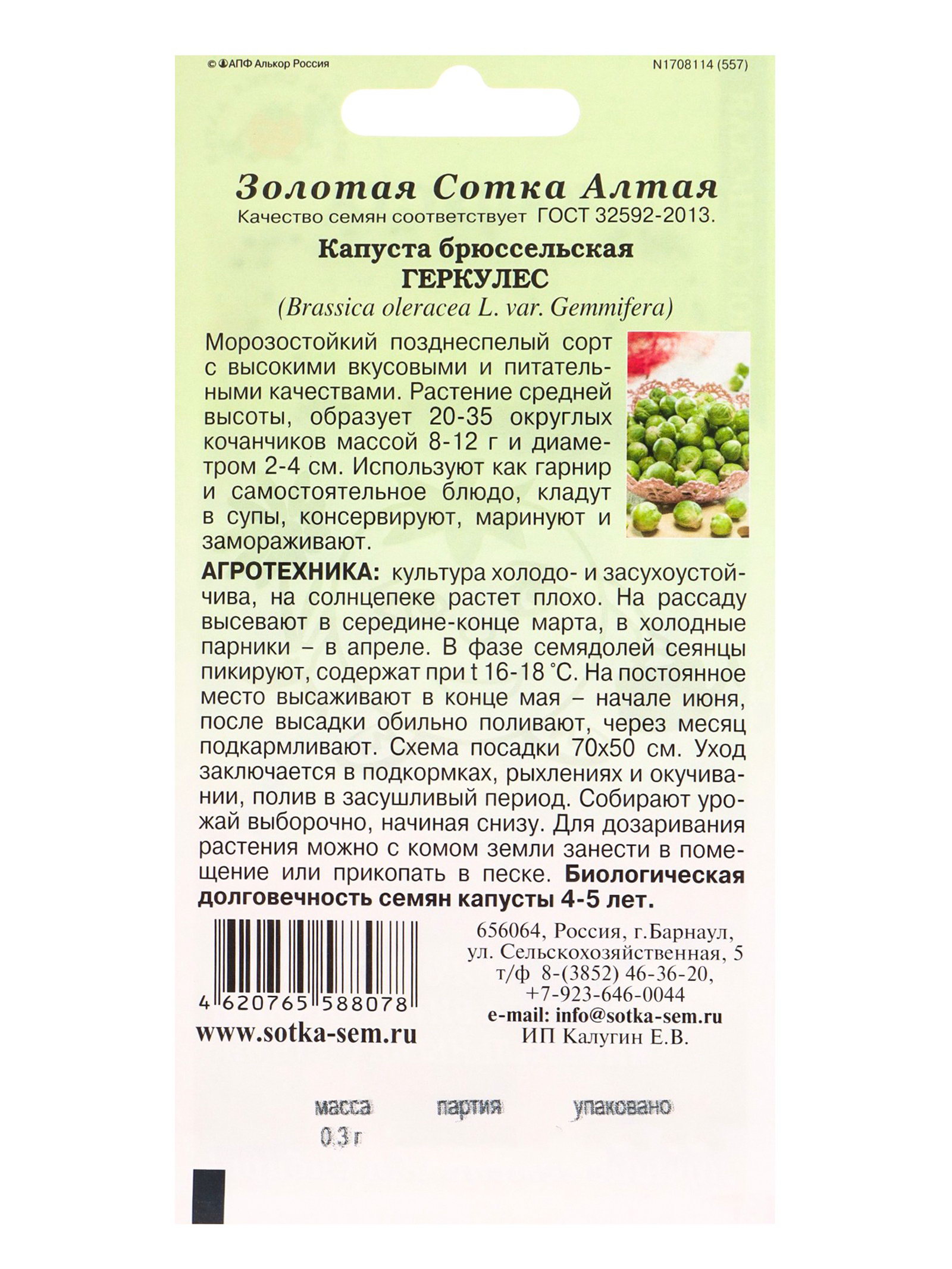 Семена Капуста "Геркулес", 0.3 г, позднеспелая, морозостойкая, Золотая Сотка Алтая, Россия