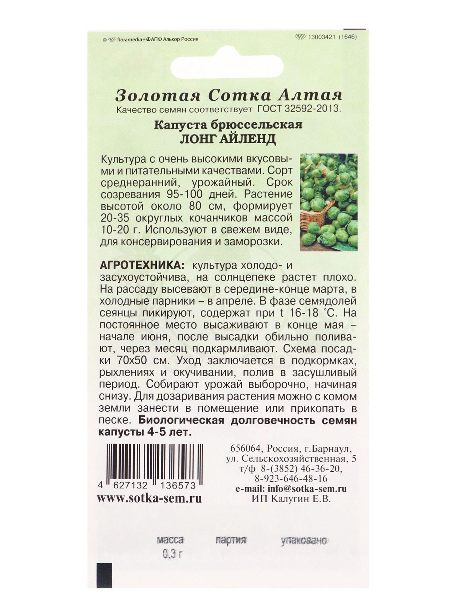 Семена Капуста "Лонг Айленд", 0.3 г, среднеранний, Золотая Сотка Алтая, Россия