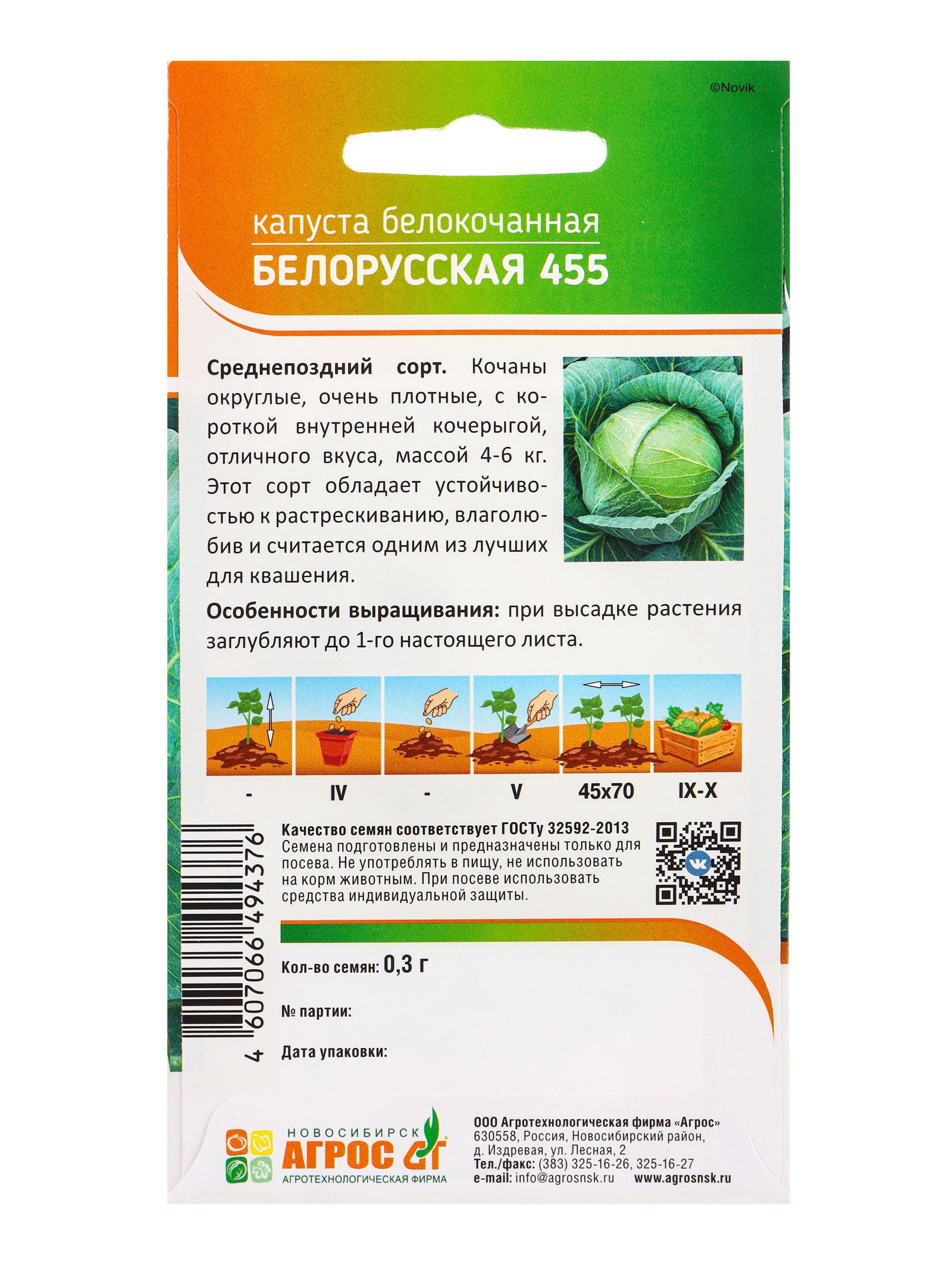 Семена Капуста "Белорусская 455" 0.3 г, Агросс, Россия