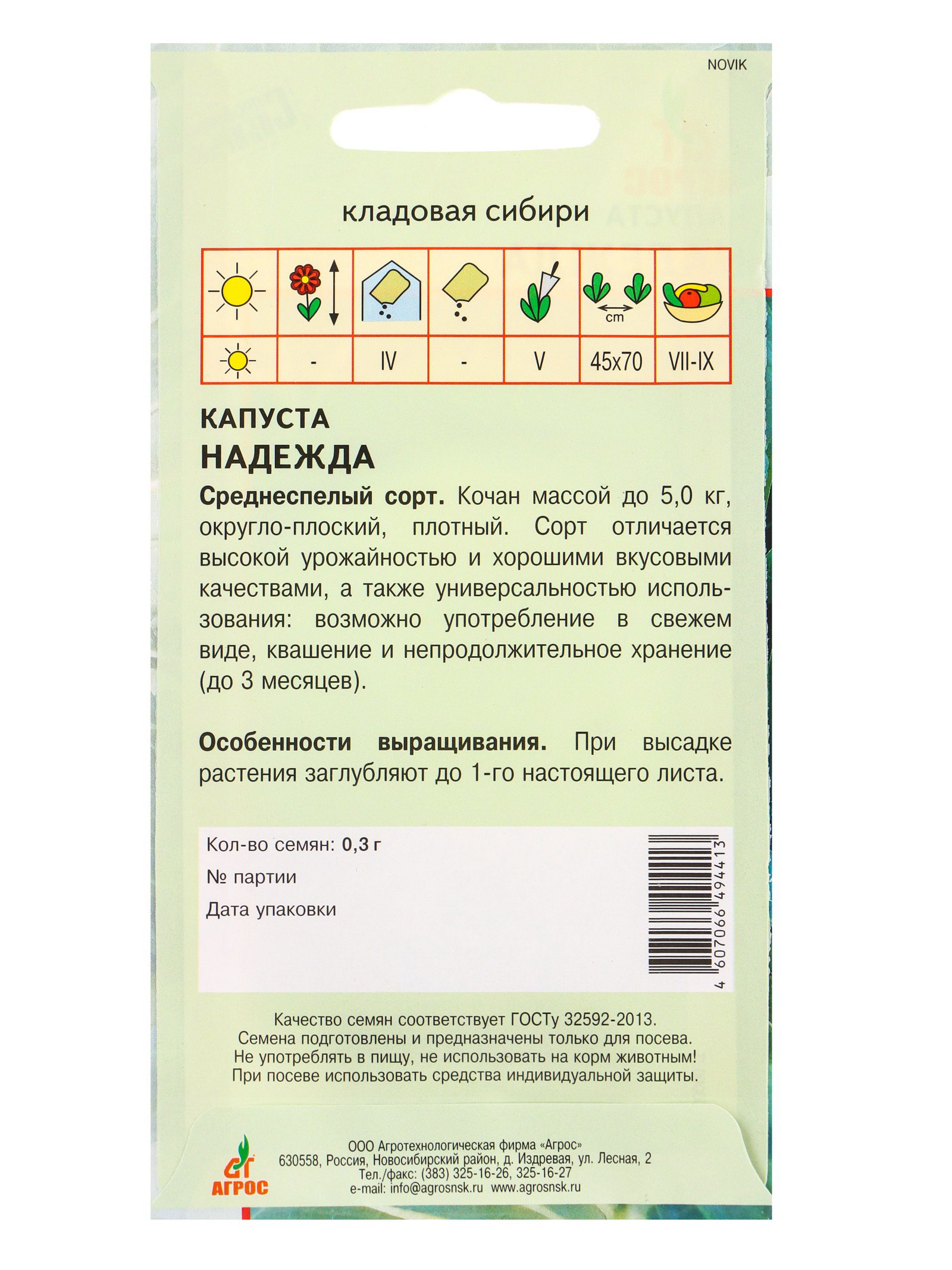 Семена Капуста "Надежда", 0.3 г, Агросс, Россия
