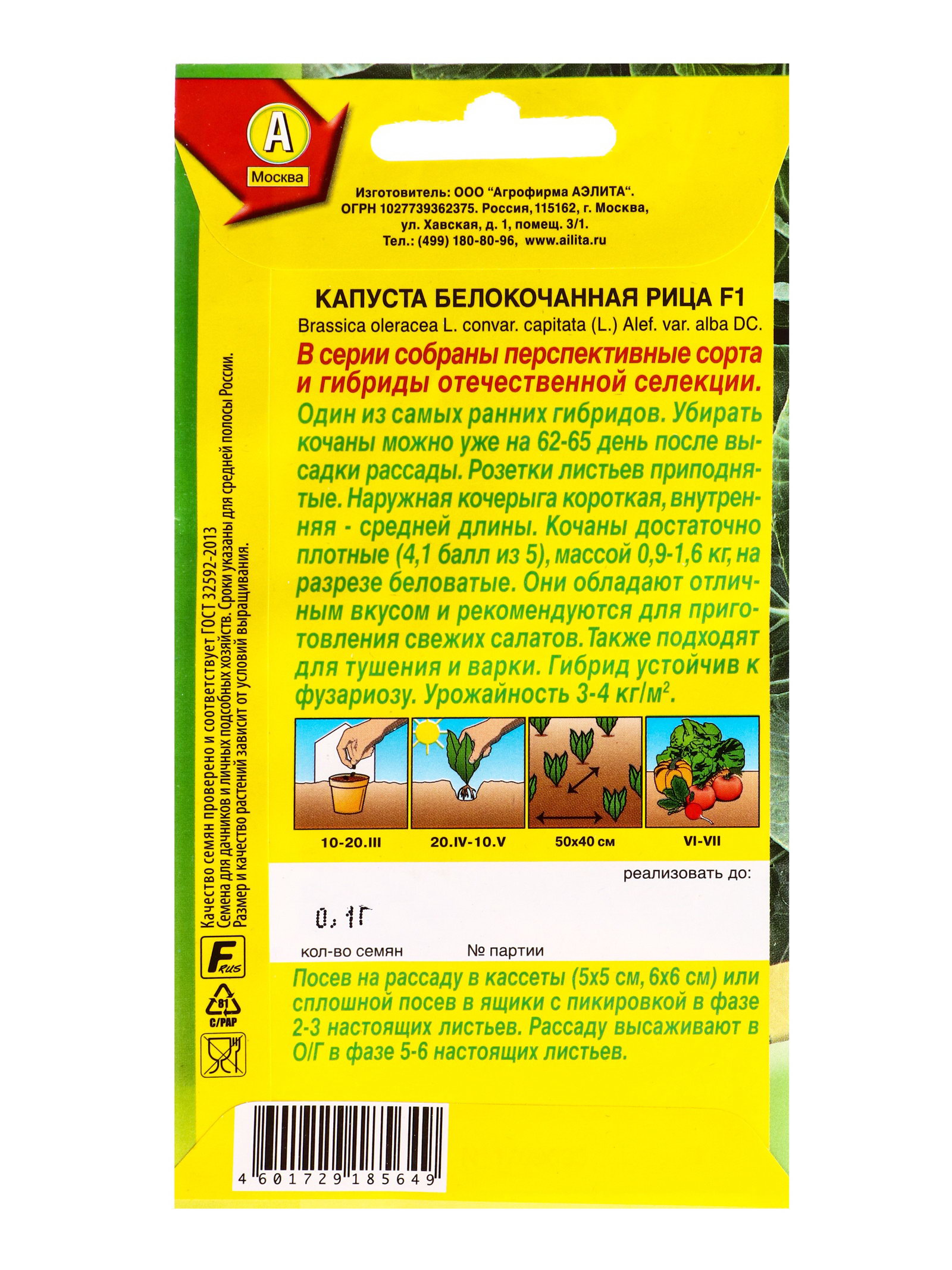 Семена Капуста б/к Рица F1 Р Отечественная С.екция, Ц/П,0.1 г, Агрофирма АЭЛИТА, Россия