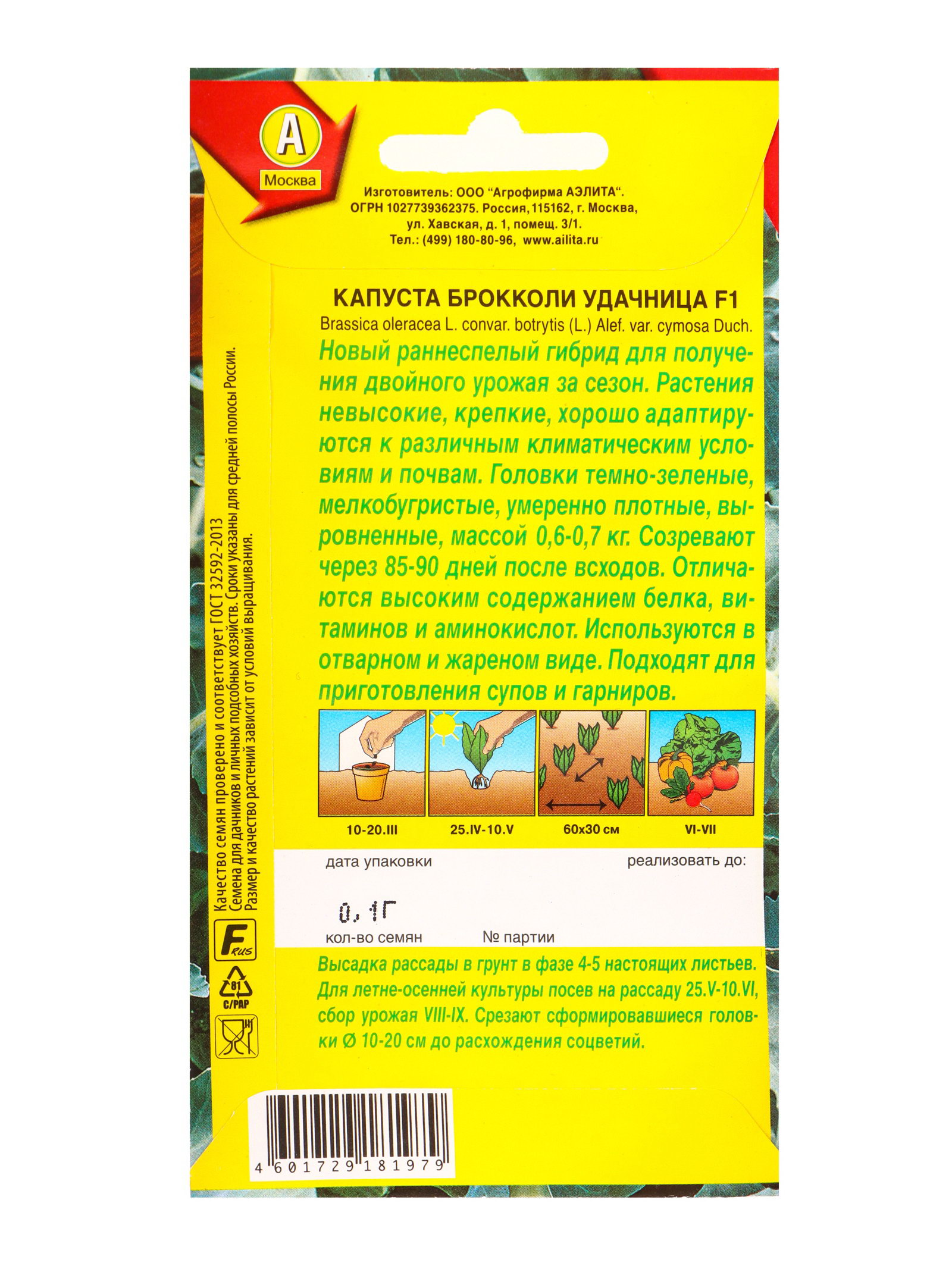 Семена Капуста брокколи Удачница F1, Ц/П,0.1 г, Агрофирма АЭЛИТА, Россия