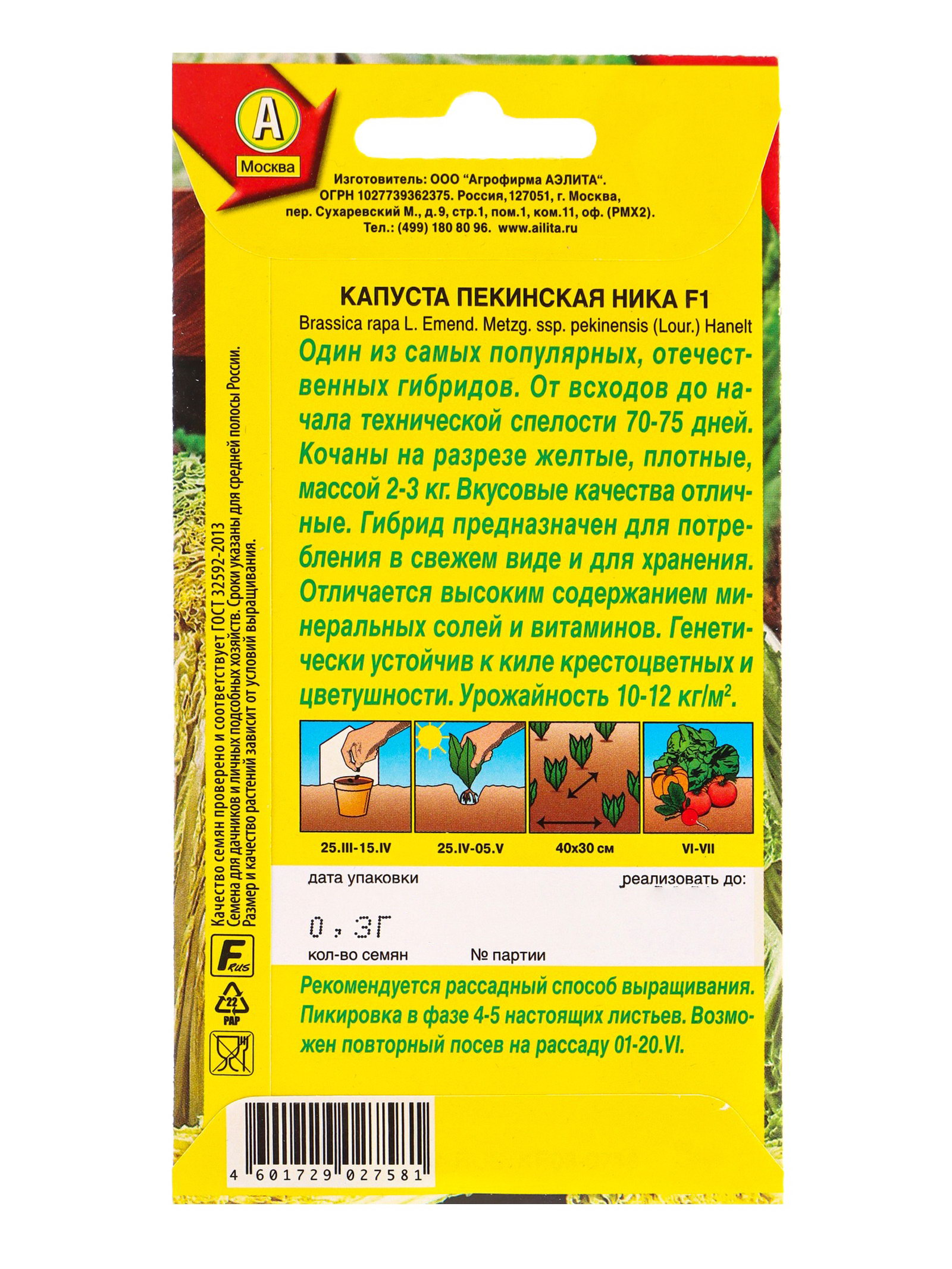 Семена Капуста пекинская Ника F1 П, Ц/П,0.3 г, Агрофирма АЭЛИТА, Россия