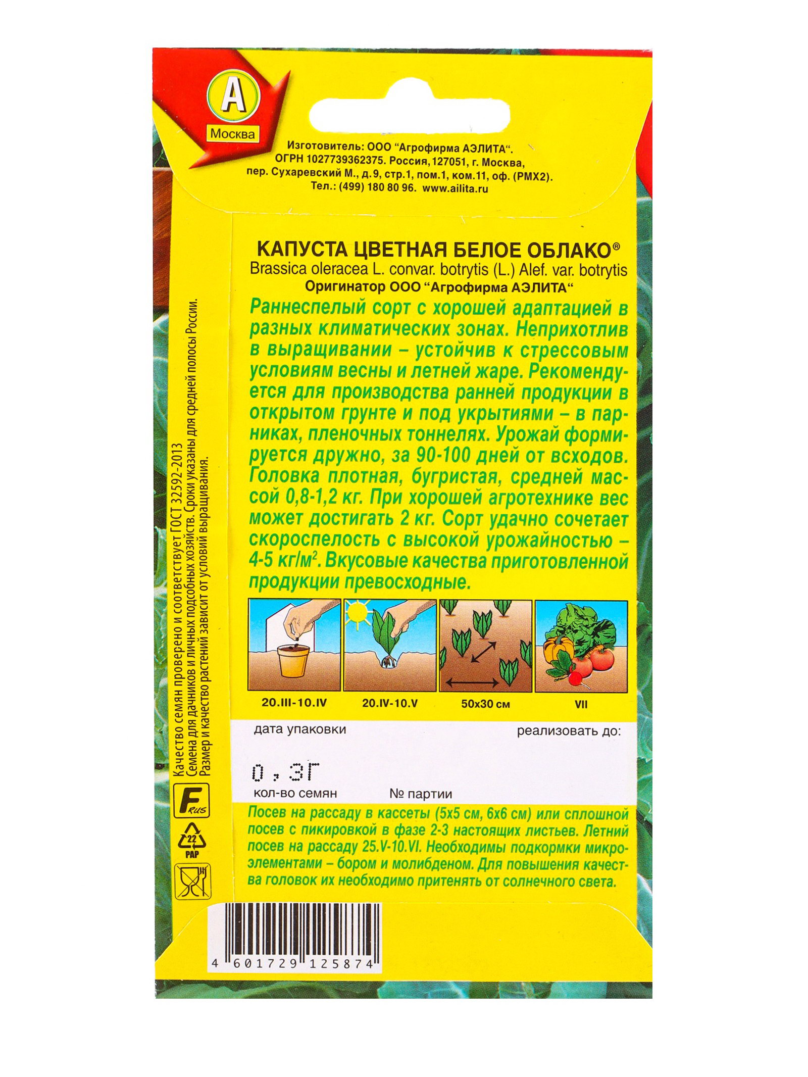 Семена Капуста цветная Белое облако Р, Ц/П,0.3 г, Агрофирма АЭЛИТА, Нидерланды