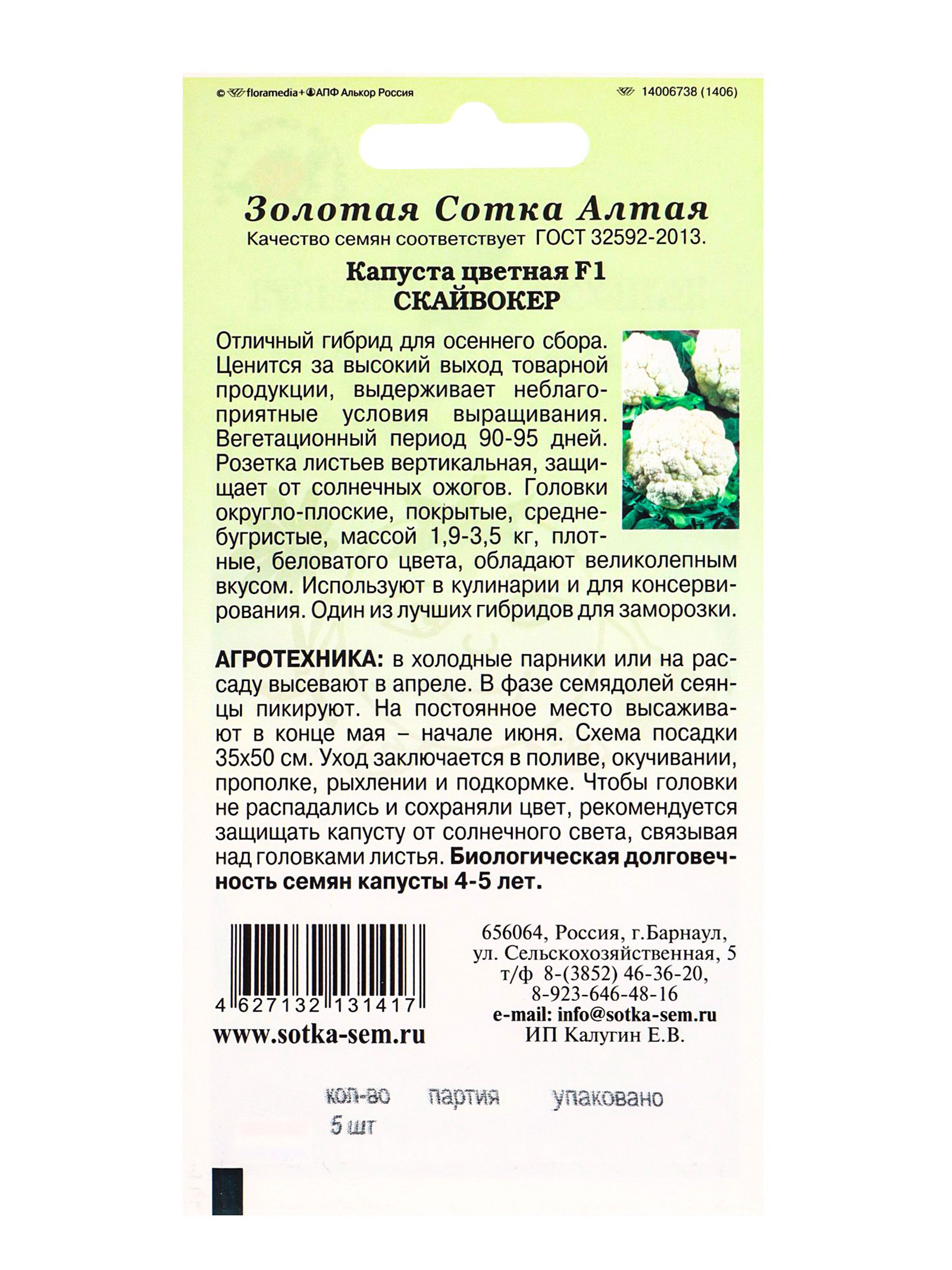 Семена Капуста цветная "Скайвокер", F1, 5 шт., позднеспелая, селекция Bejo Zaden, Золотая Сотка Алтая, Россия