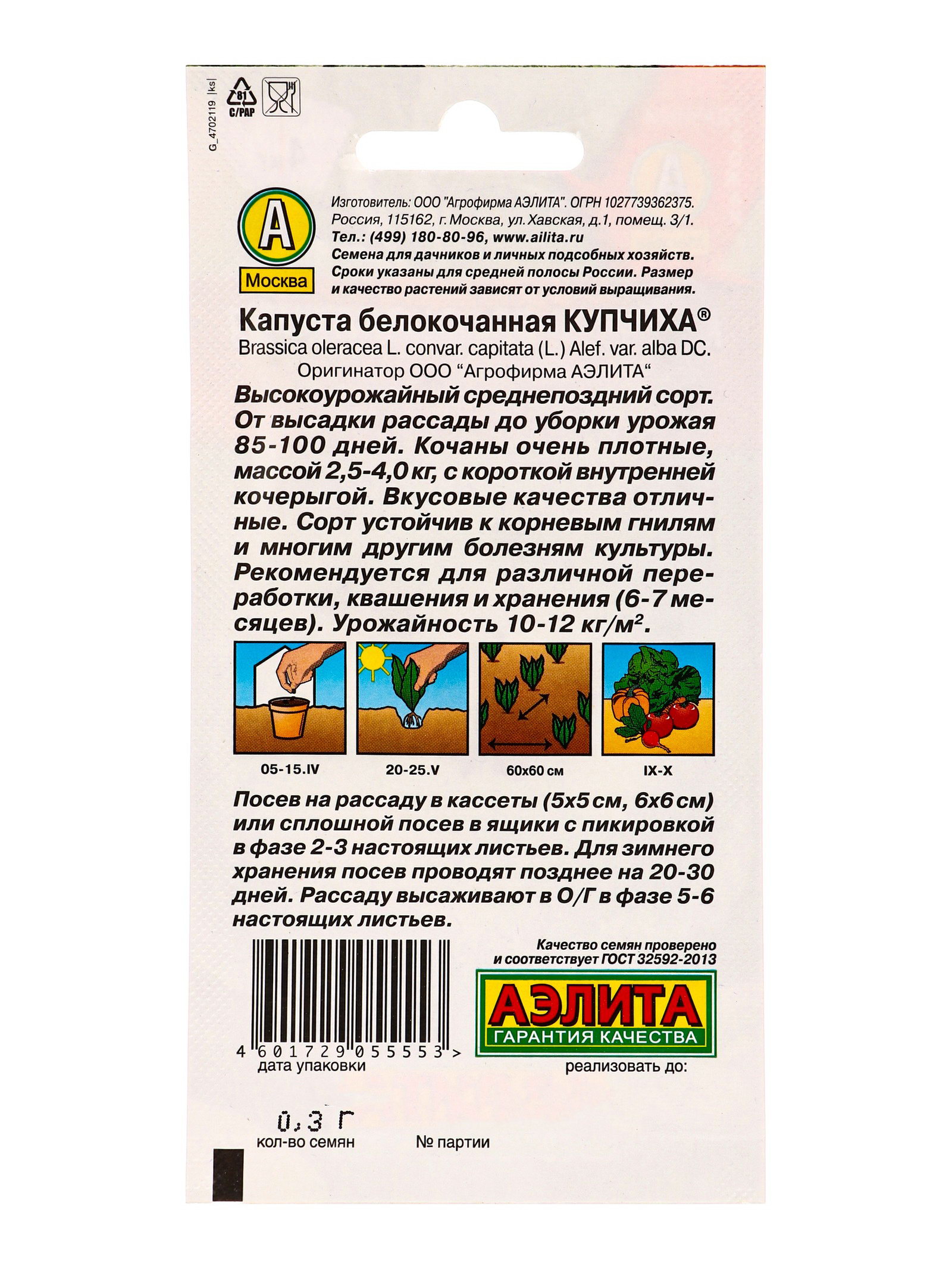 Семена Капуста б/к Купчиха П, Ц/П,0.3 г, Агрофирма АЭЛИТА, Узбекистан