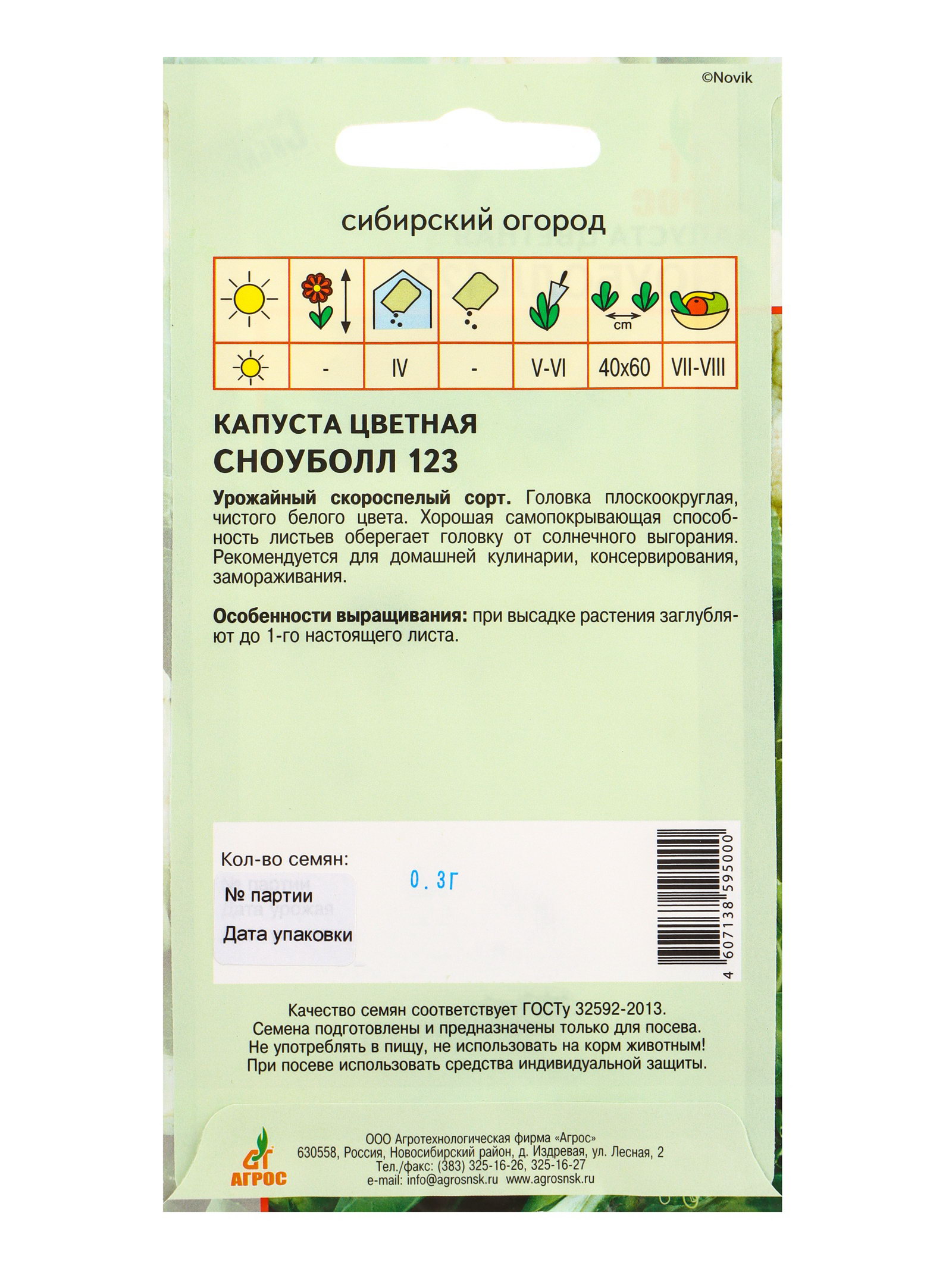 Семена Капуста цветная "Сноуболл 123" 0.3 г, Агросс, Россия