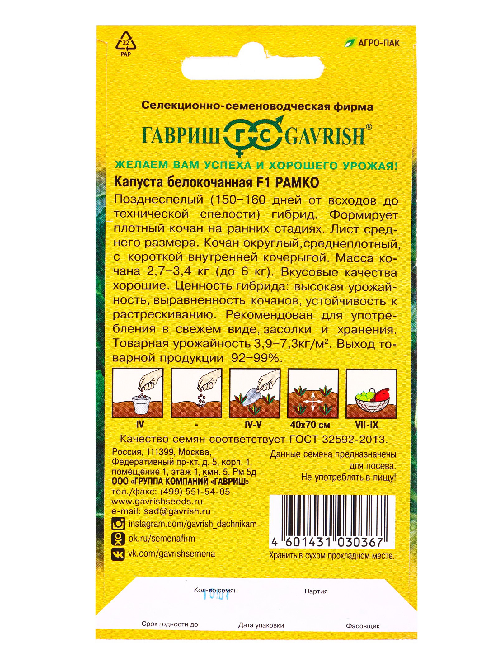 Семена Капуста белокочанная "Рамко", F1, 10 шт., поздняя,, Гавриш, Россия