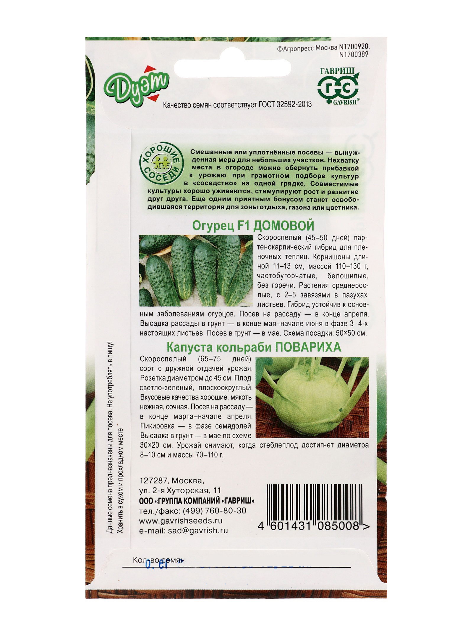 Семена Капуста кольраби "Повариха", 0.3 г + Огурец "Домовой", F1, 0.3 г, "Гавриш. Дуэт", Гавриш, Россия