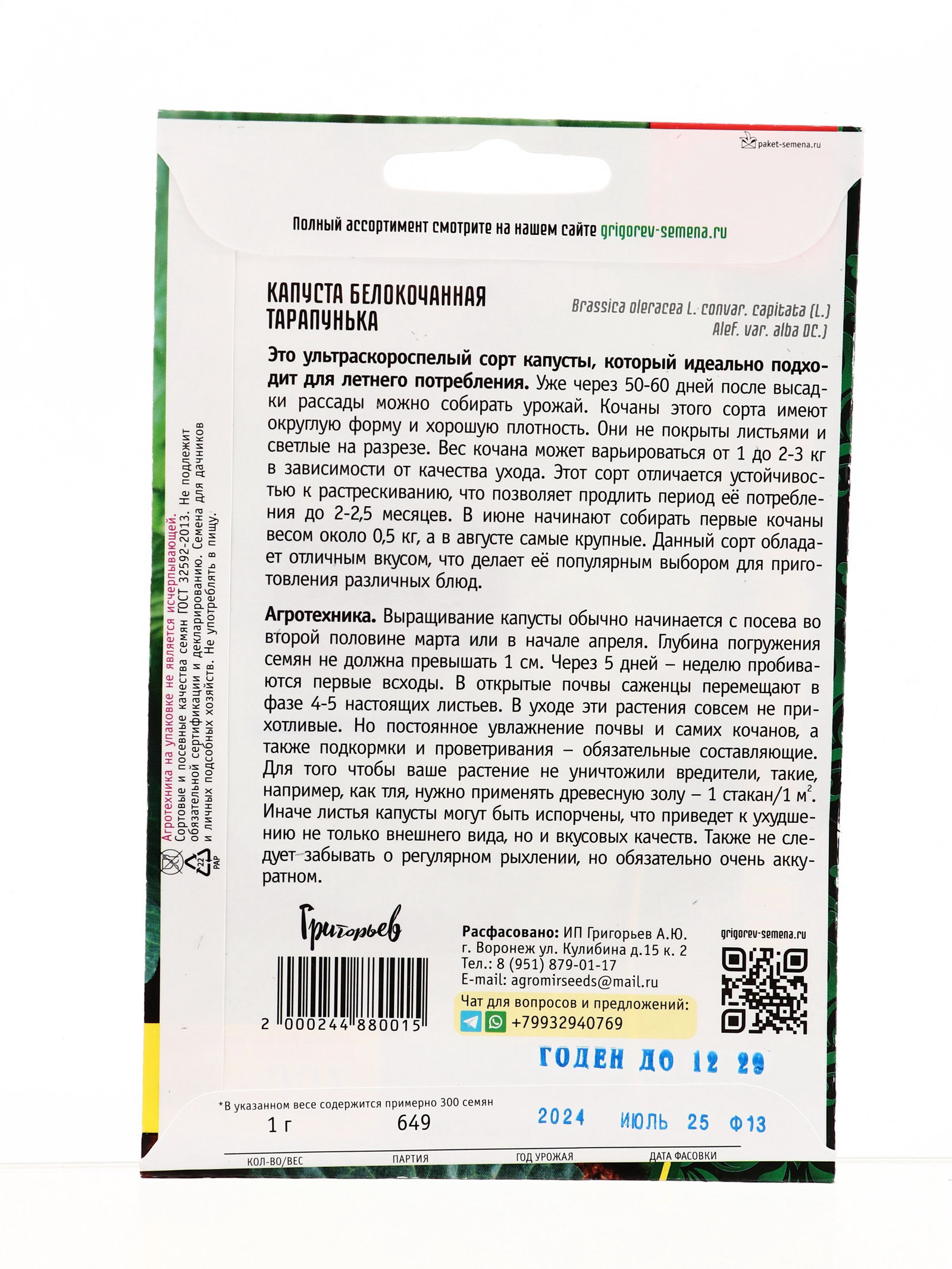 Семена цветов Капуста б/к Тарапунька ультраранняя 1г. 12.29 гр, Григорьев, Россия