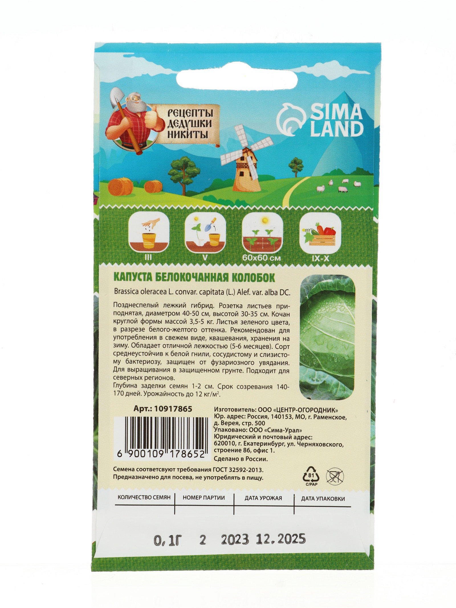 Семена Капуста белокочанная "Колобок", 0.1 г, 7x15x1 см., Рецепты дедушки Никиты, Россия