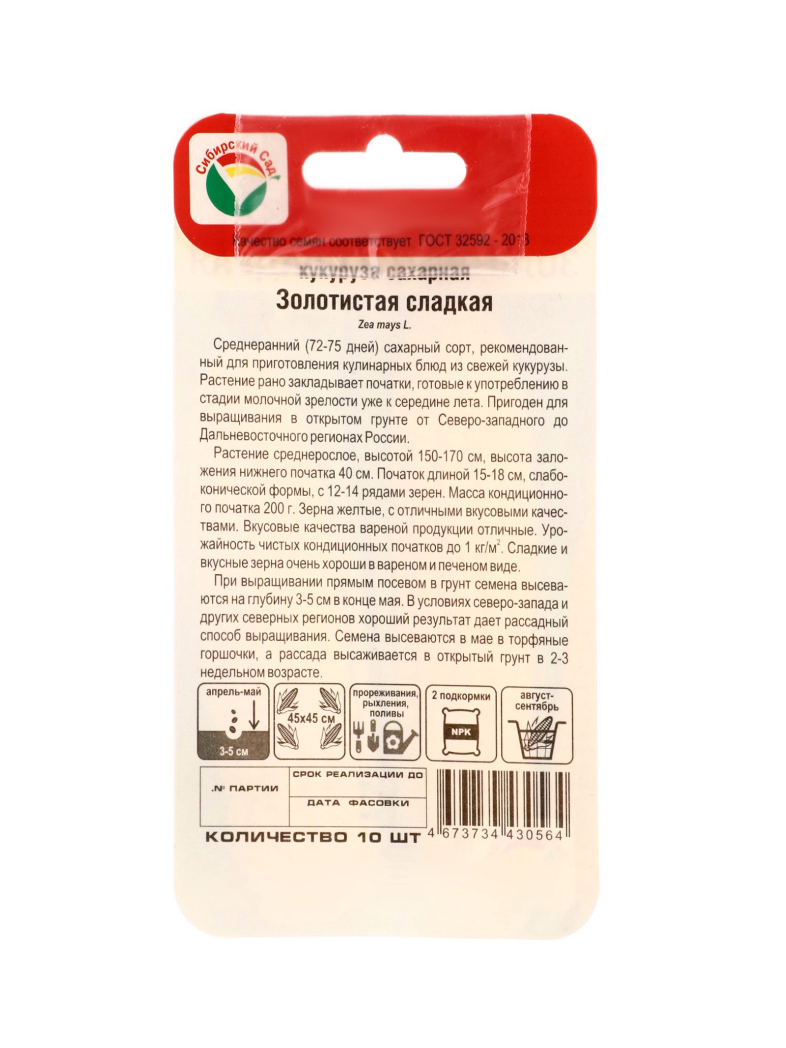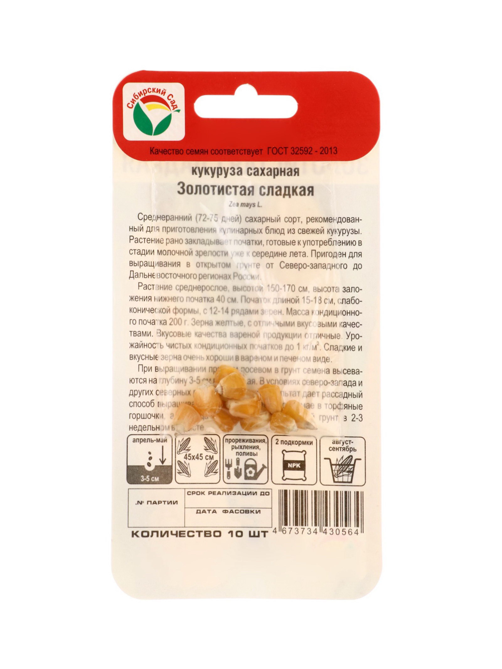 Семена Кукуруза Золотистая сладкая 10 шт., Сибирский сад, Россия
