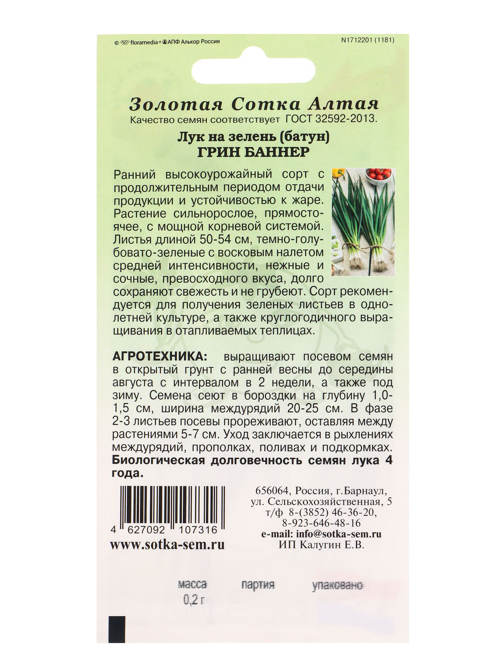 Семена Лук На зелень Грин Баннер /Сотка/ 0.2г/*1200, Золотая Сотка Алтая, Россия