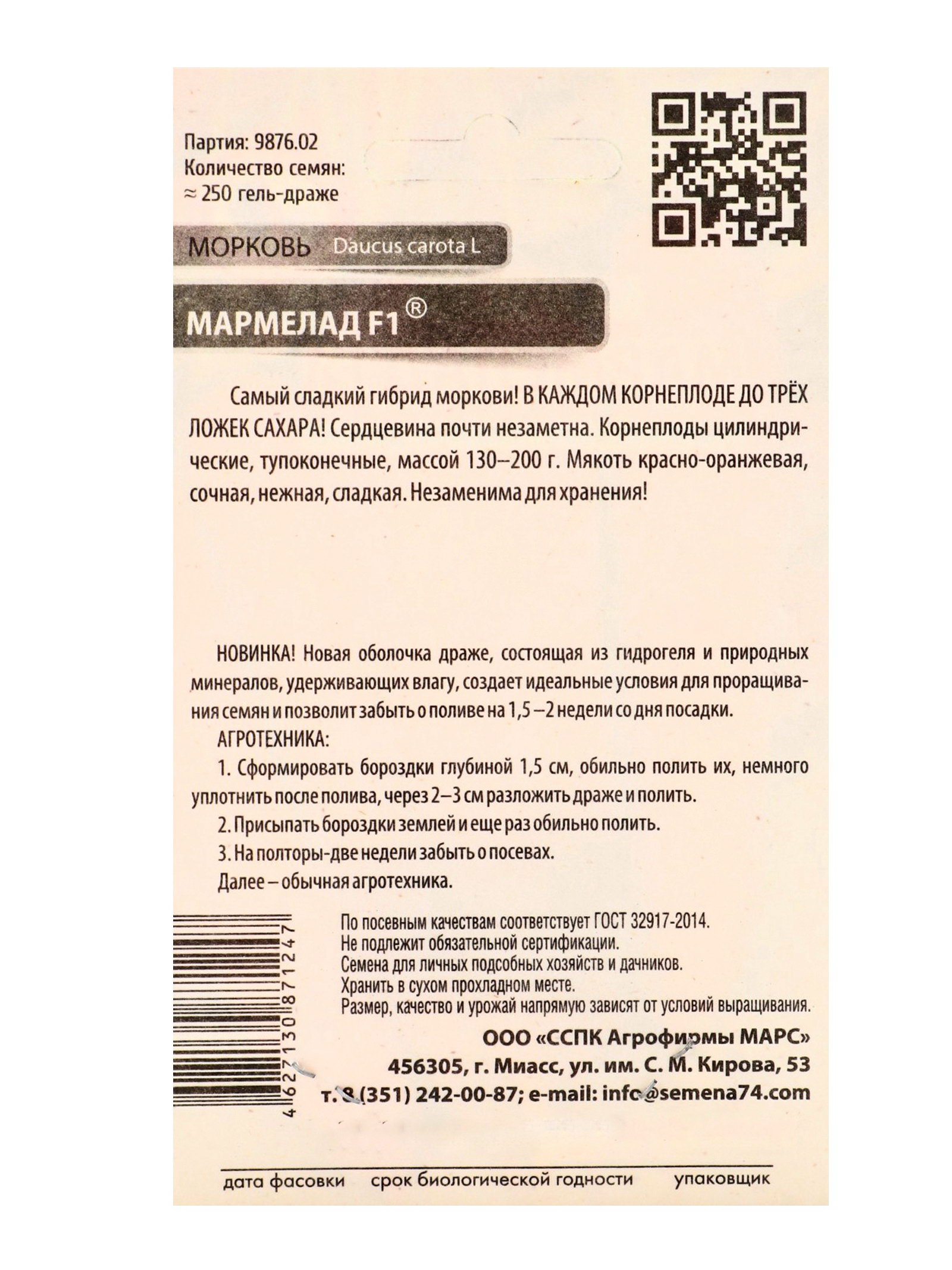 Семена Морковь "Мармелад", F1, гелевое драже, 250 шт., "Уральский дачник", Уральский Дачник, Россия
