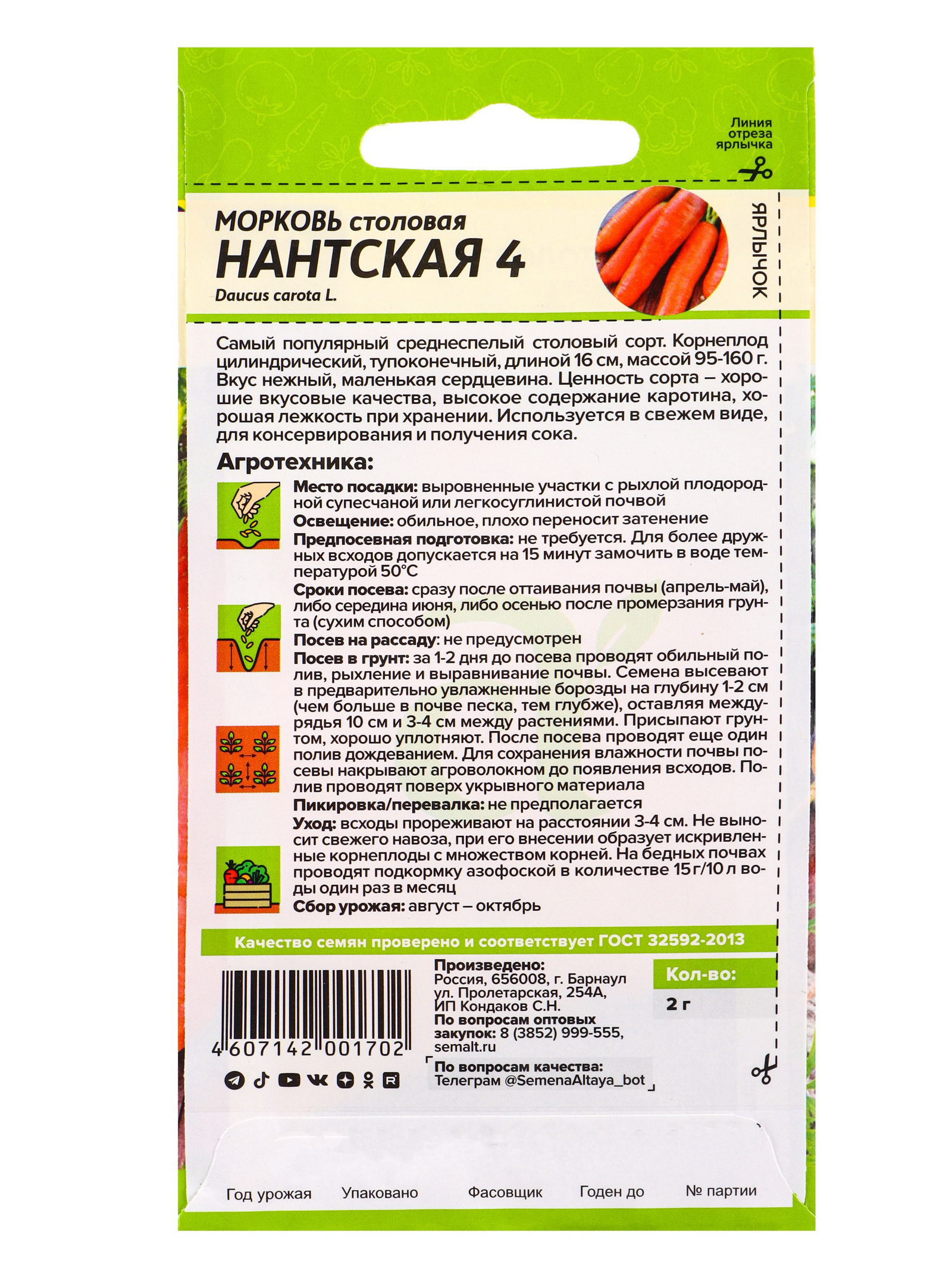 Семена Морковь "Нантская 4", 2 г, Семена Алтая, Россия