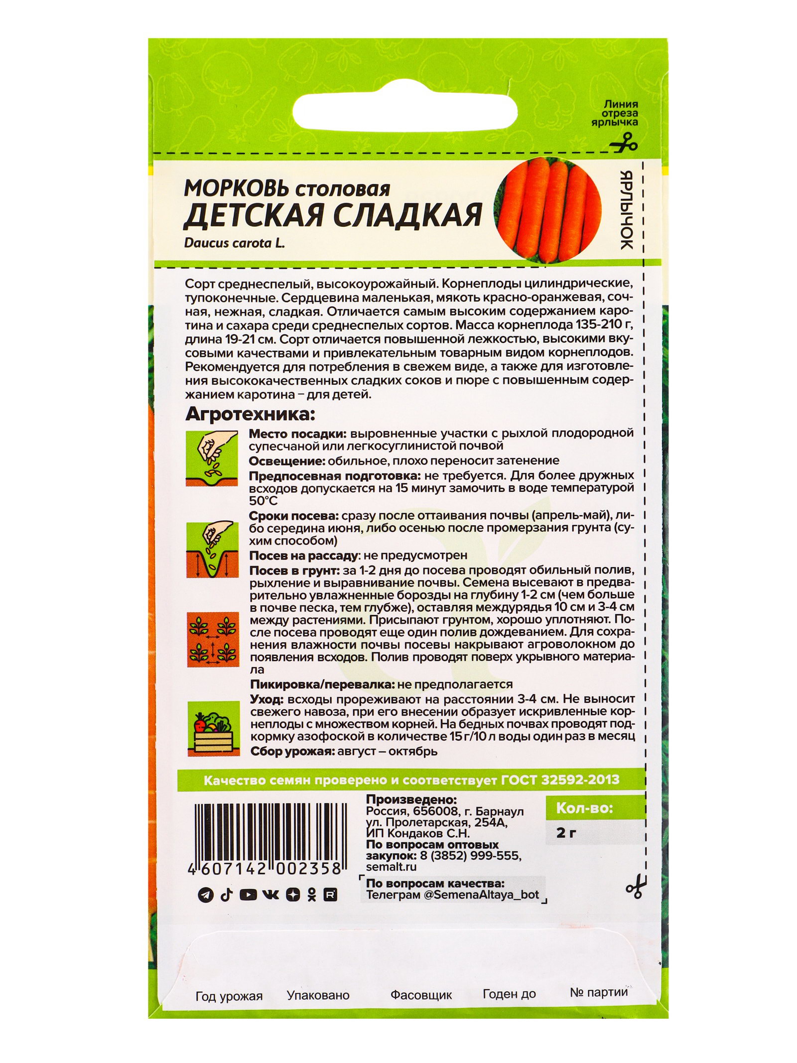 Семена Морковь "Детская сладкая", 2 г, Семена Алтая, Россия