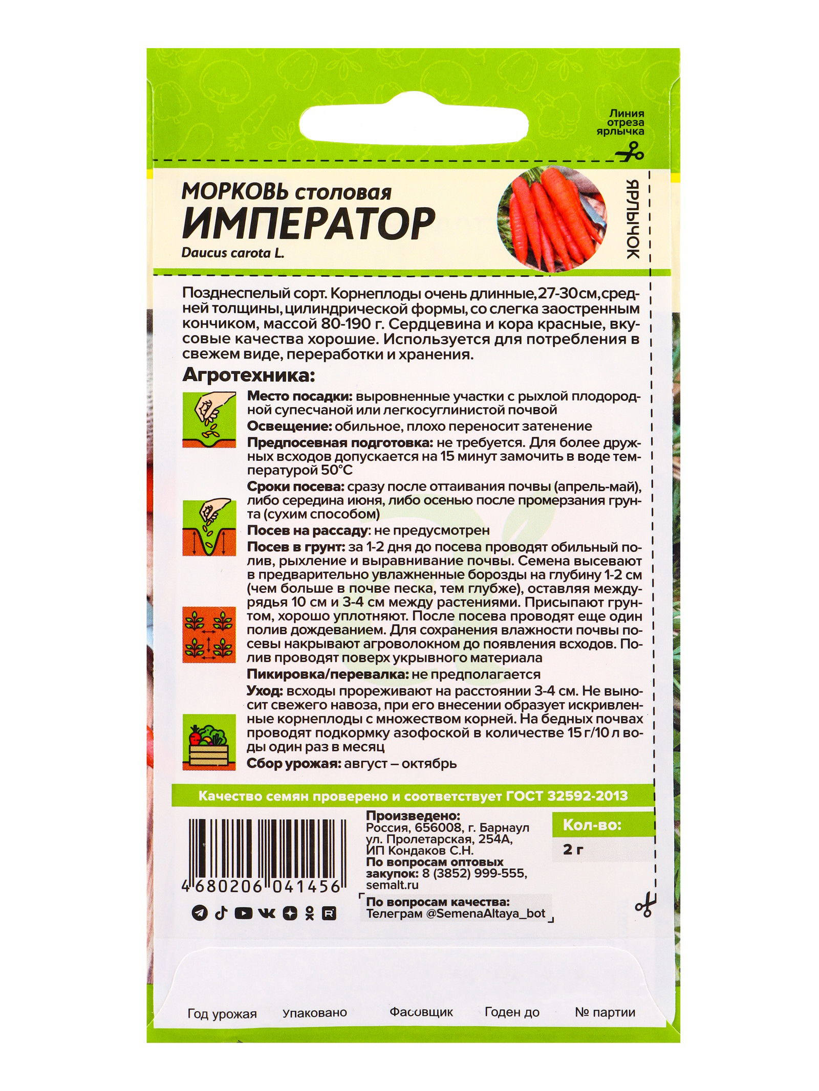 Семена Морковь "Император", 2 г, Семена Алтая, Россия