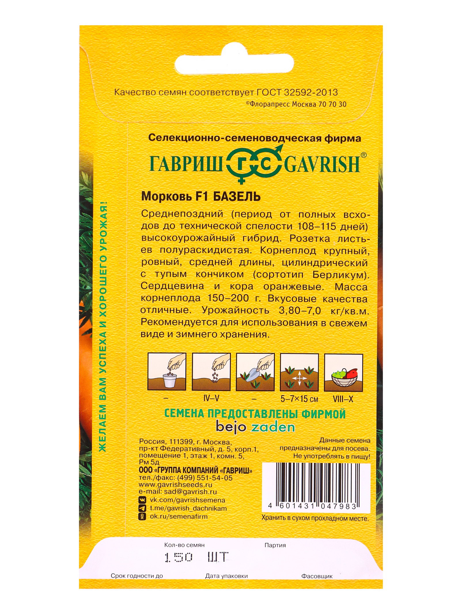 Семена Морковь Базель F1 150 шт., Гавриш, Россия