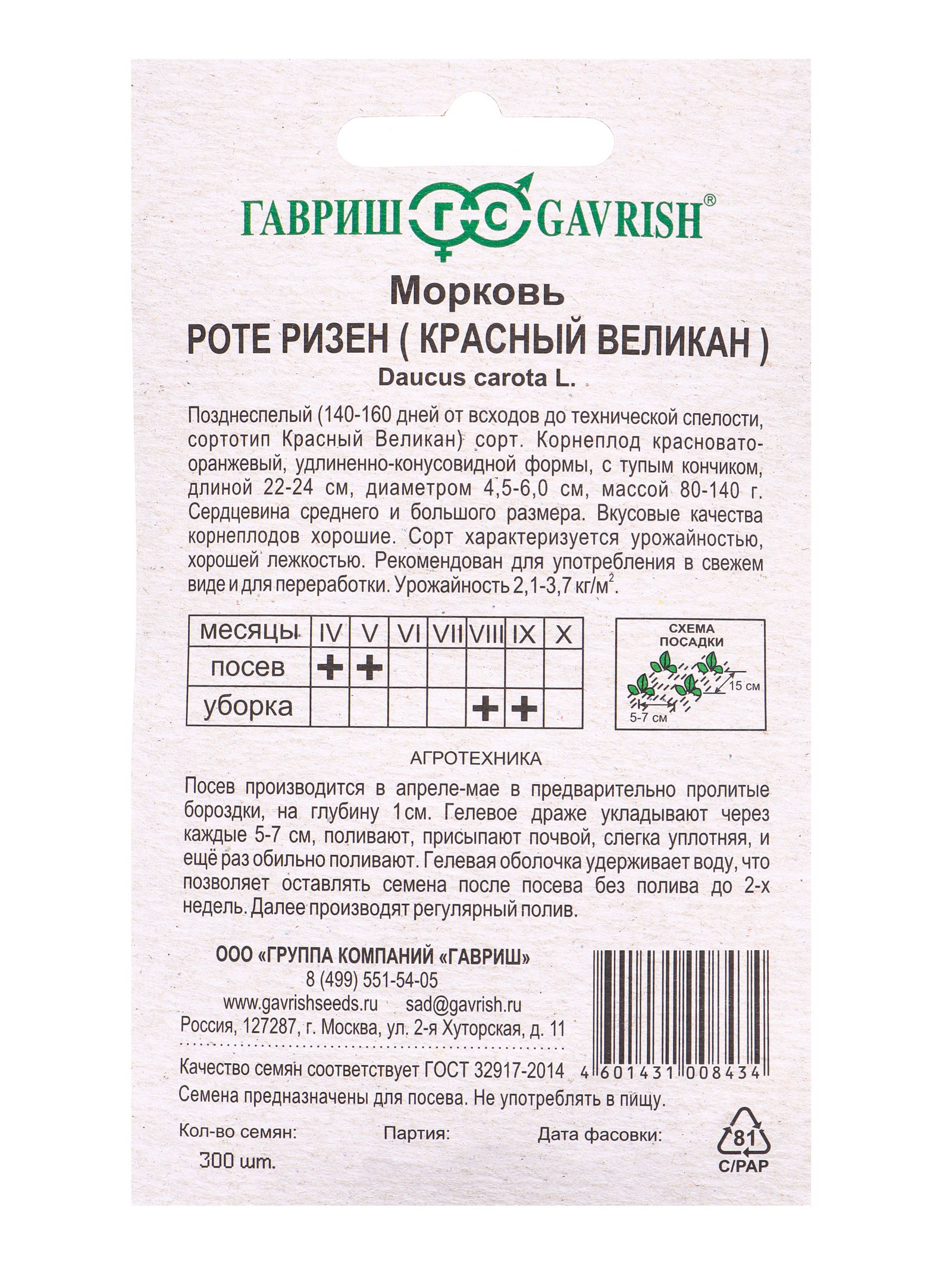 Семена Морковь гранулированный Роте Ризен 300 шт. гель, Гавриш, Россия