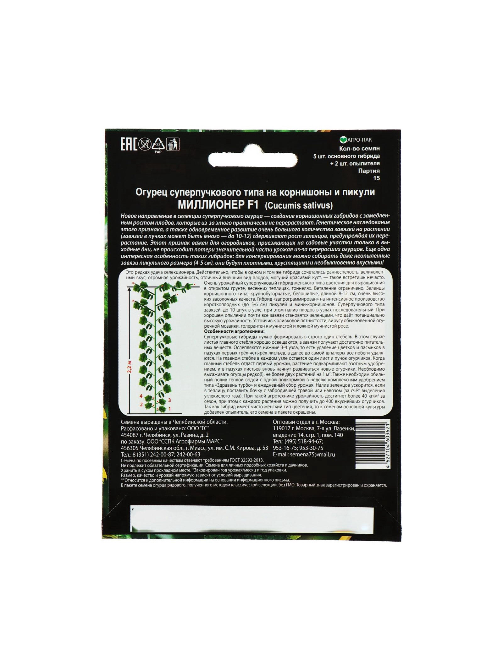 Семена огурец "Миллионер F1", раннеспелый, урожайный, партенокарпический, 7 шт., Уральский Дачник, Россия