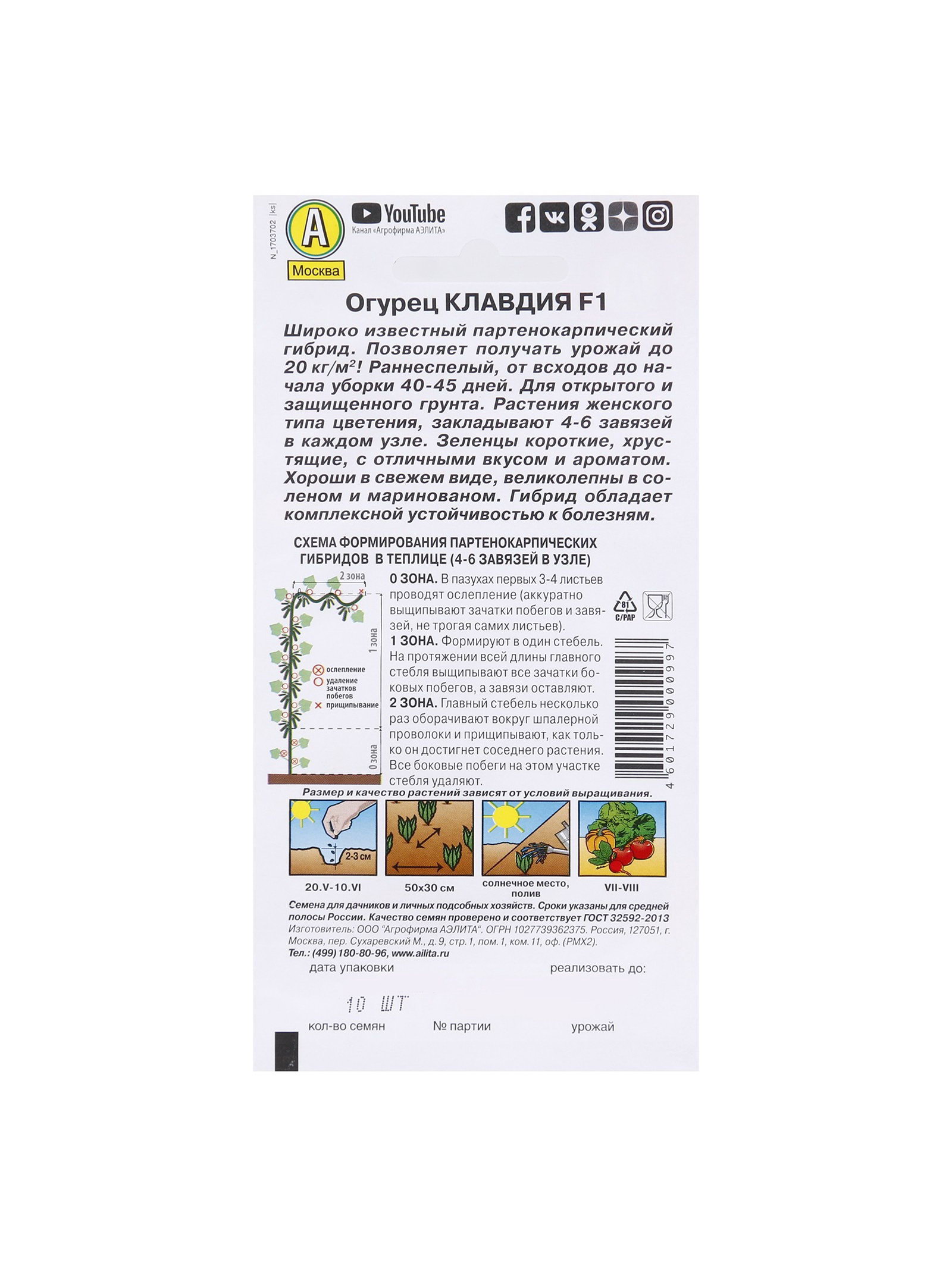Семена Огурец "Клавдия F1", раннеспелый, партенокарпическии, 10 шт, Агрофирма АЭЛИТА, Россия
