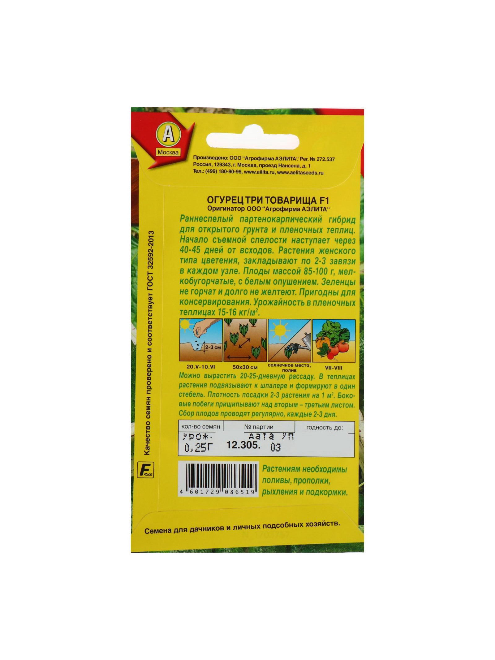 Сроки созревания: Ранний, Ранний ( до 48 дней) Размер упаковки: 7.5 x 0.1 x 12 см. Вьющиеся (лианы): Да Ампельные: Да Размер: Корнишоны (до 12 см) см Гладкие: Нет Бугорчатые: Да Бугорчатые: Да tnved: 1209918000 Упаковка: Цветная Особенности выращивания: Универсальный Сорт или гибрид: Гибрид F1 Вегетационный период, дни: 42 Агрономический срок годности, лет: 7 Вид: Партенокарпические Сорт: F1 Раннеспелый партенокарпический гибрид для открытого грунта и пленочных теплиц. Начало съемной спелости наступает через 40-45 дней от всходов. Растения женского типа цветения, закладывают по 2-3 завязи в каждом узле. Плоды массой 85-100 г, мелкобугорчатые, с белым опушением. Зеленцы не горчат и долго не желтеют. Пригодны для консервирования. Урожайность в пленочных теплицах 15-16 кг/ м 2 . Посев Посев семян в грунт или на рассаду. Возраст рассады при высадке – 20-30 дней. Плотность посадки в открытом грунте 4-5 растений, в теплицах 2-3 растения на 1 кв.м. В теплицах растения подвязывают к шпалере и формируют в один стебель. Боковые побеги прищипывают над 2-3 листом. Растениям необходимы регулярные поливы, прополки, рыхления и подкормки. Сбор плодов нужно проводить регулярно каждые 2-3 дня. | ||