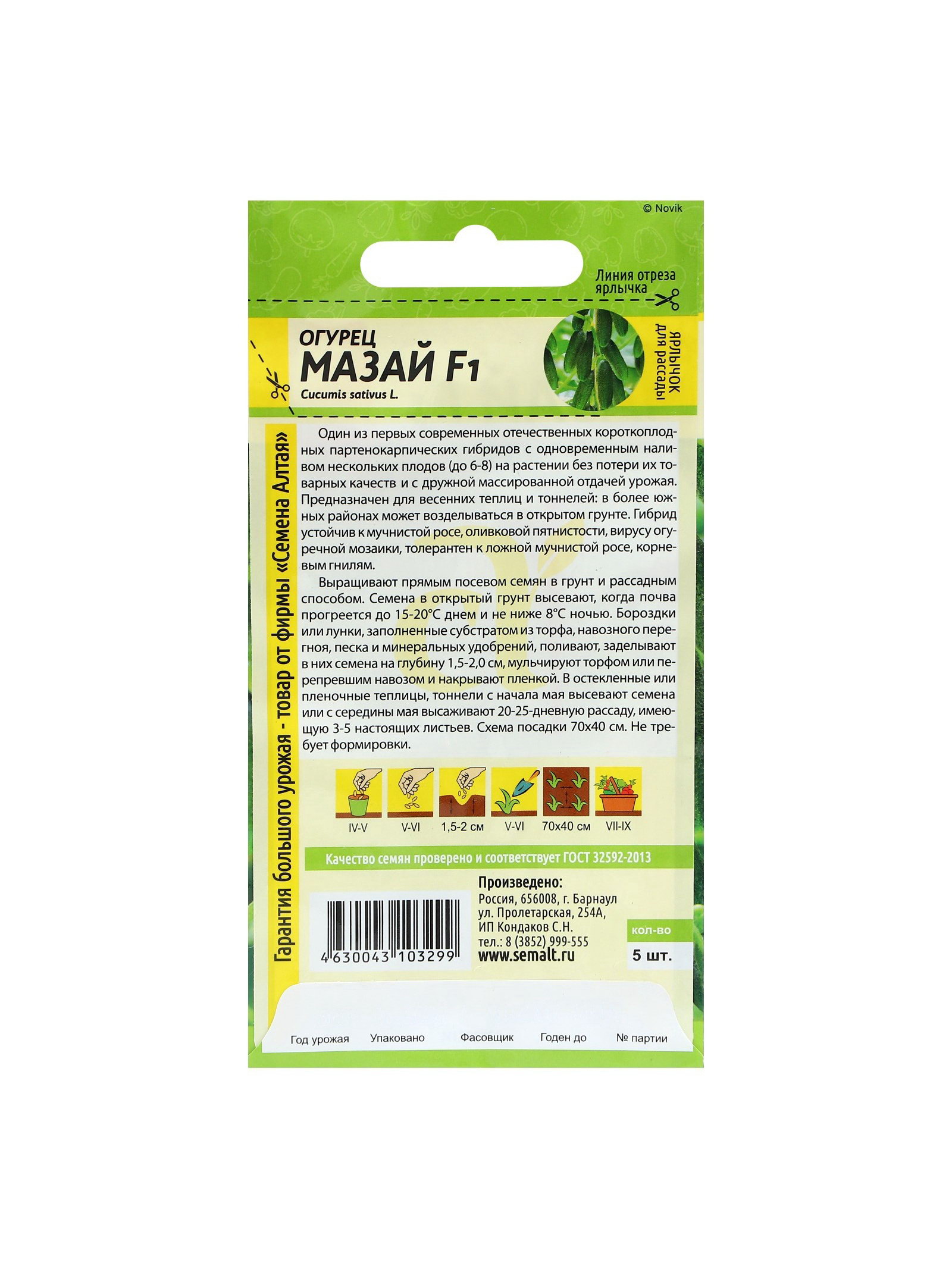 Семена Огурец "Мазай", раннеспелый, партенокарпический, цп, 5 шт., Семена Алтая, Россия