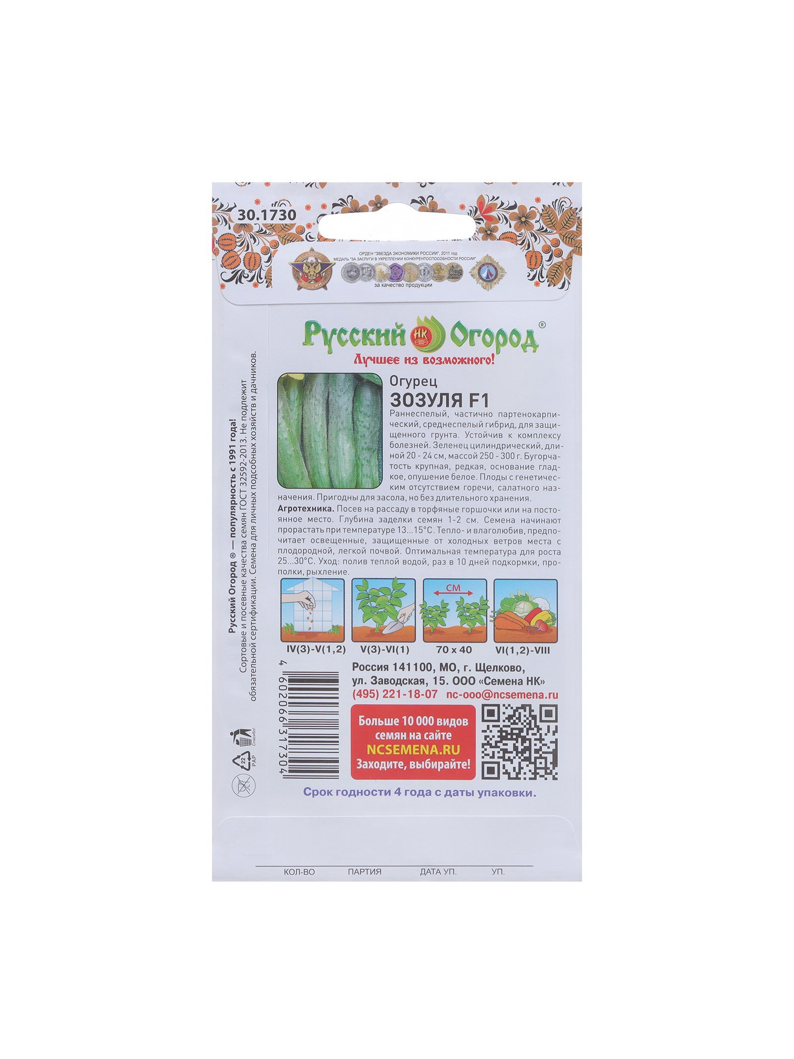 Семена огурца "Зозуля", серия F1, 10 шт., Русский огород, Россия