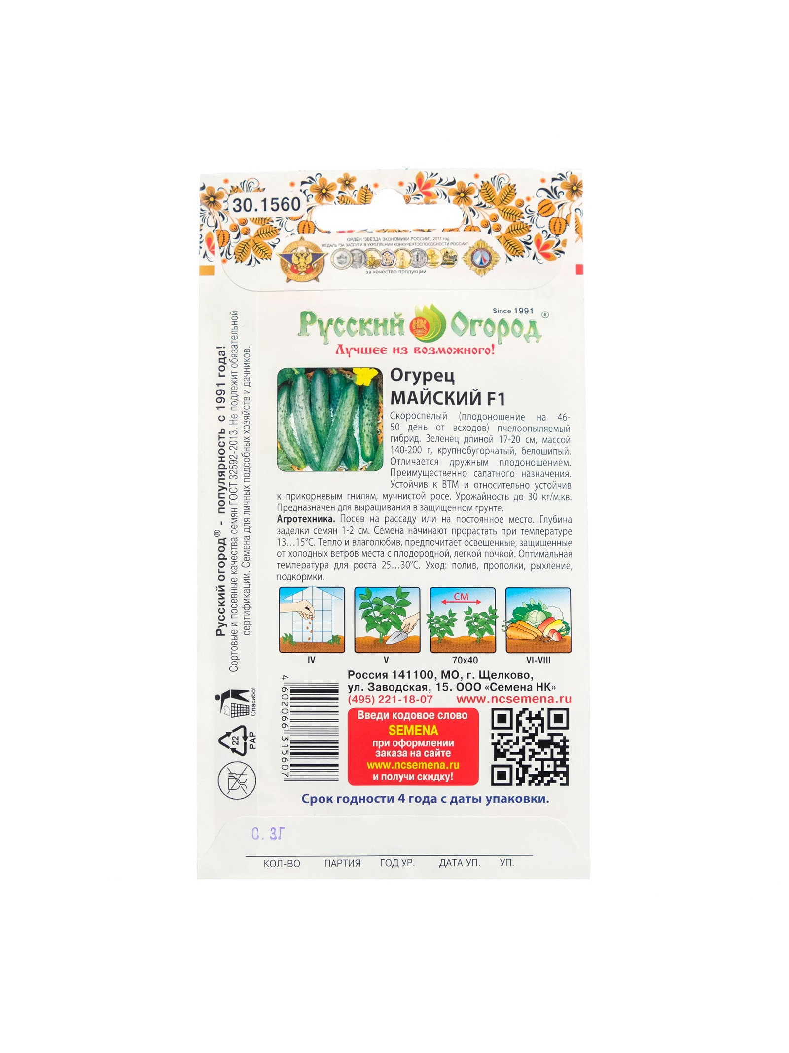 Семена Огурец "Майский" F1, серия скороспелый, пчелоопыляемый, 0.3 г, Русский огород, Россия