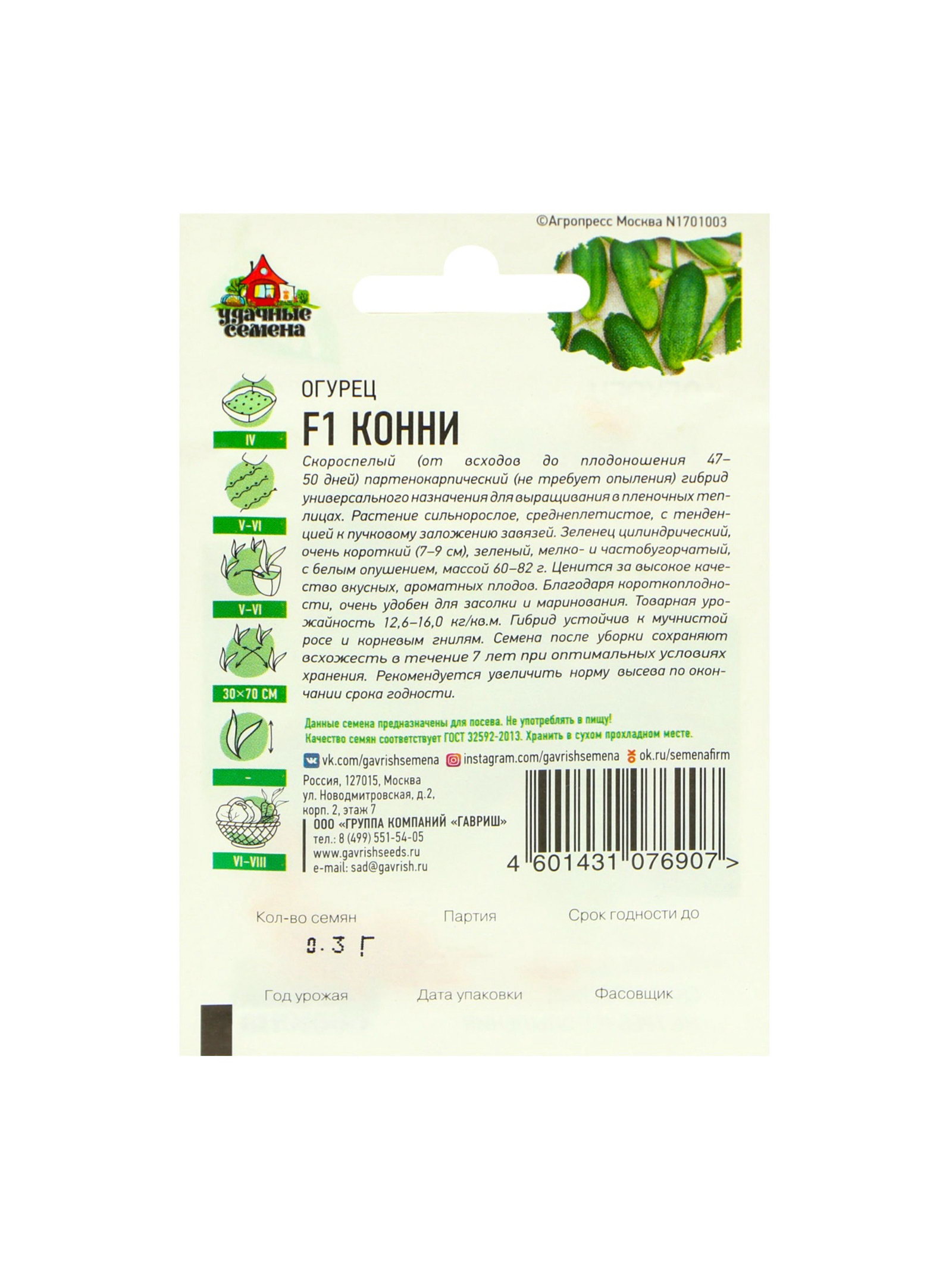 Семена Огурец "Конни" F1, скороспелый, партенокарпический, 0.3 г, Гавриш, Россия