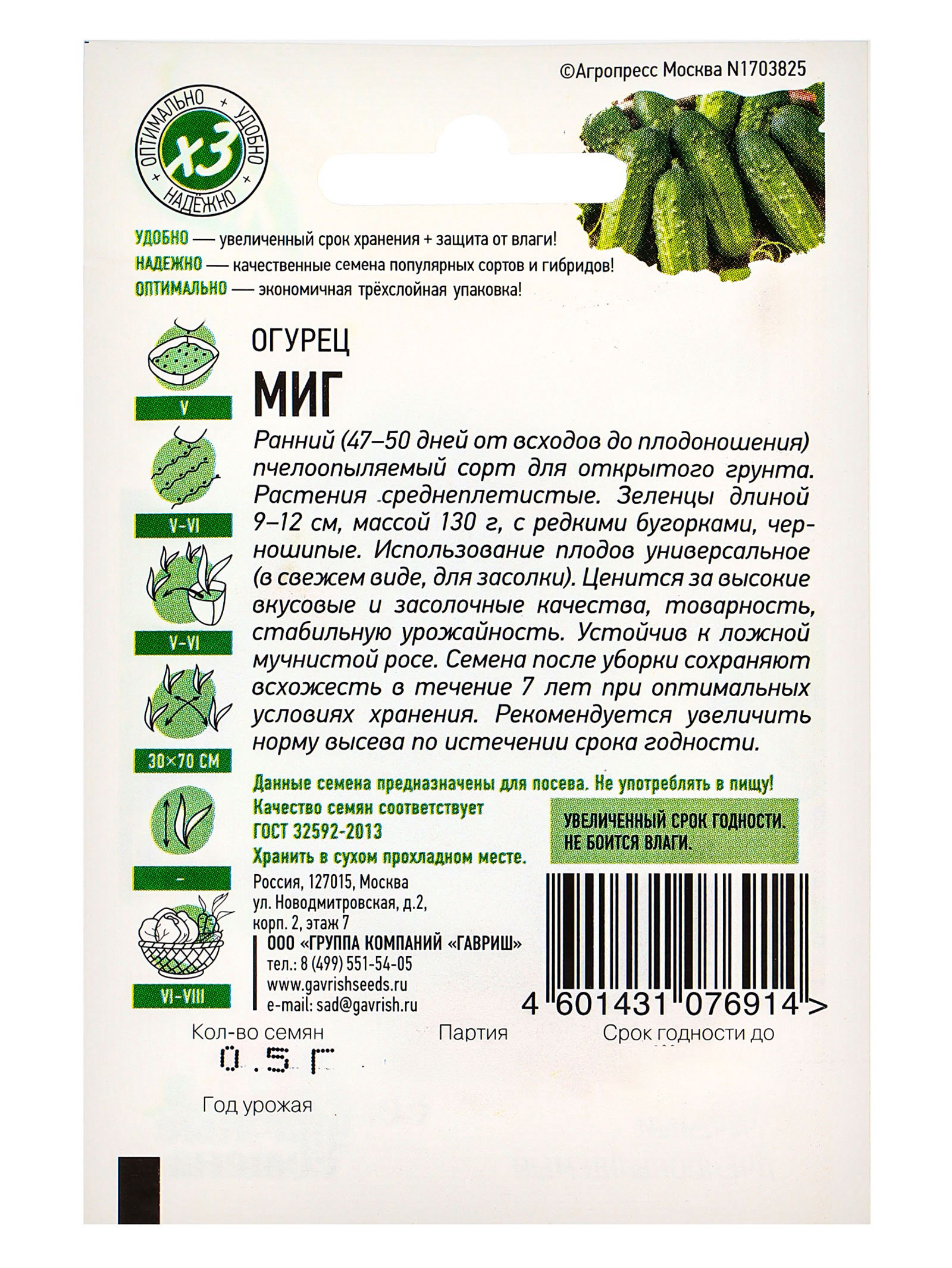 Семена Огурец "Миг", раннеспелый, пчелоопыляемый, 0.3 г серия ХИТ х3, Гавриш, Россия