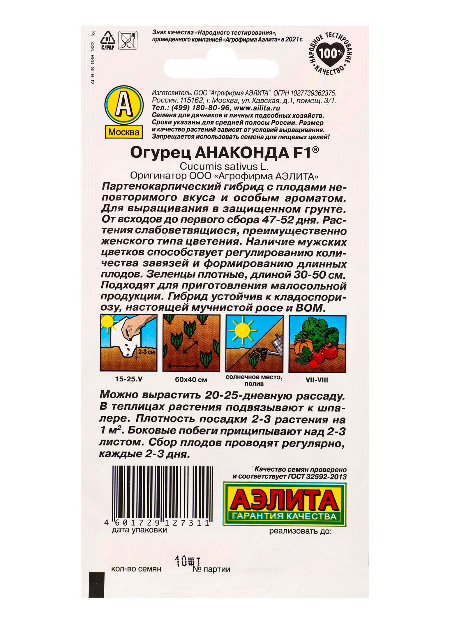 Семена огурца "Анаконда", F1, 10 шт., Агрофирма АЭЛИТА, Китай