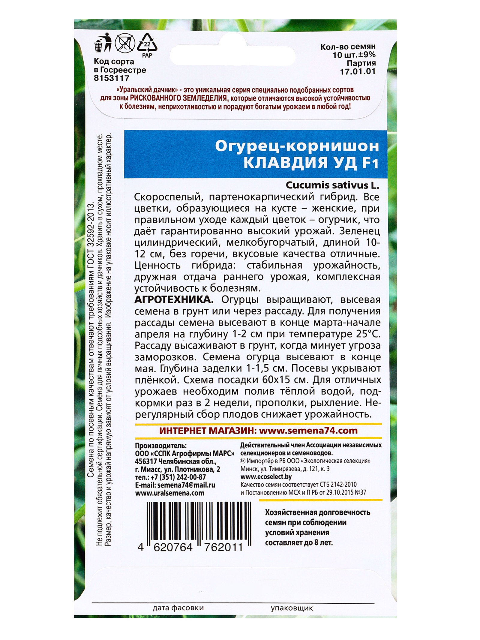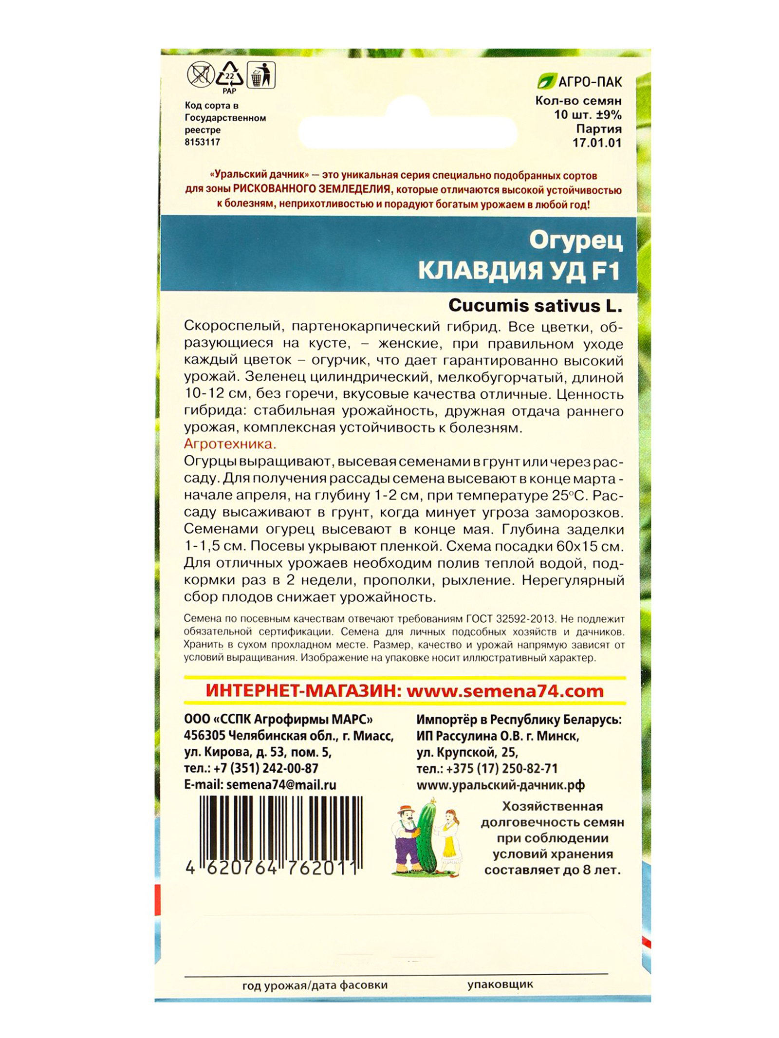 Семена Огурец "Клавдия" F1, раннеспелый, партенокарпический, без горечи, 10 шт, Уральский Дачник, Россия