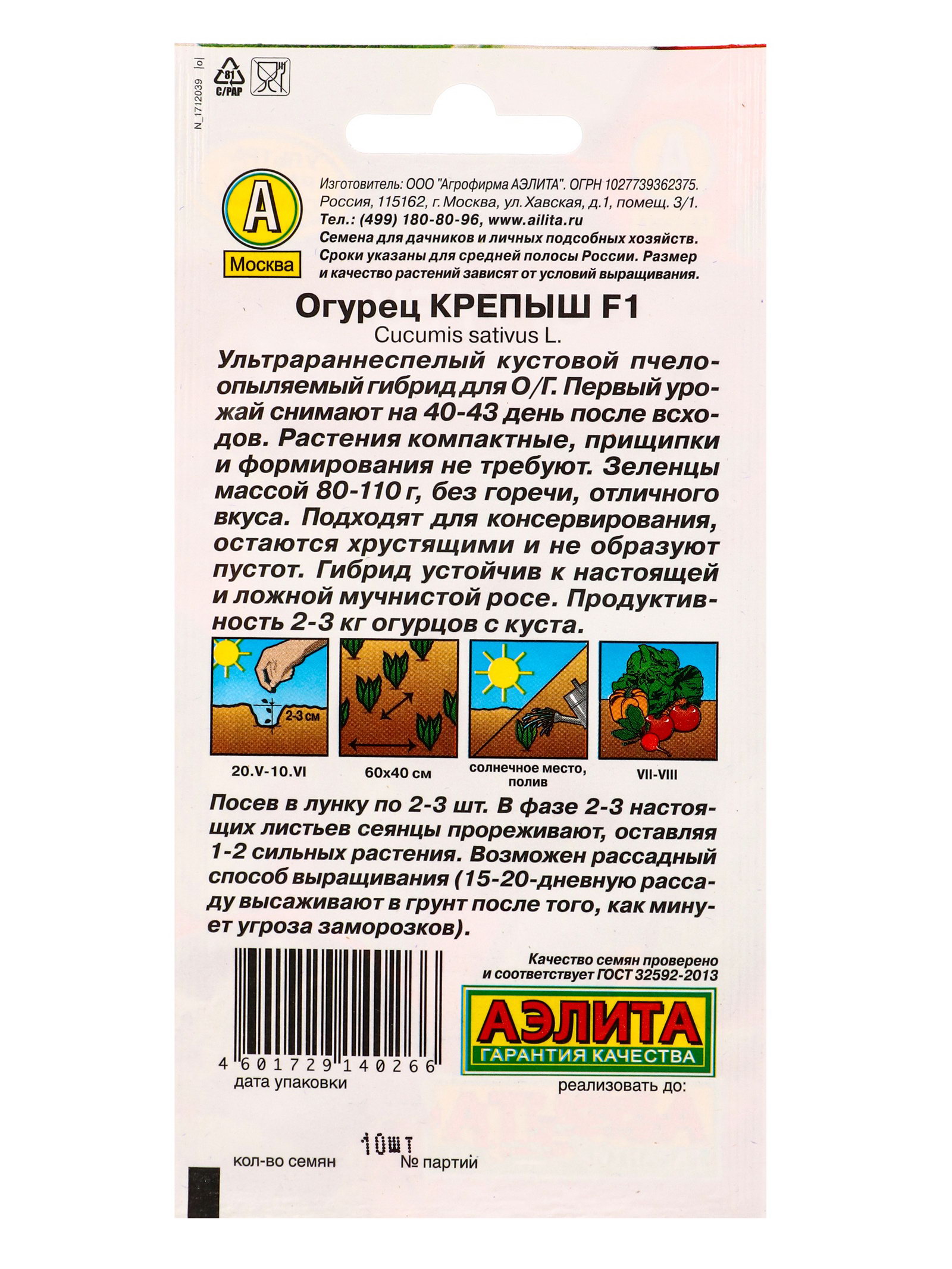 Семена Огурец "Крепыш" F1, раннеспелый, пчелоопыляемый, 10 шт, Агрофирма АЭЛИТА, Польша