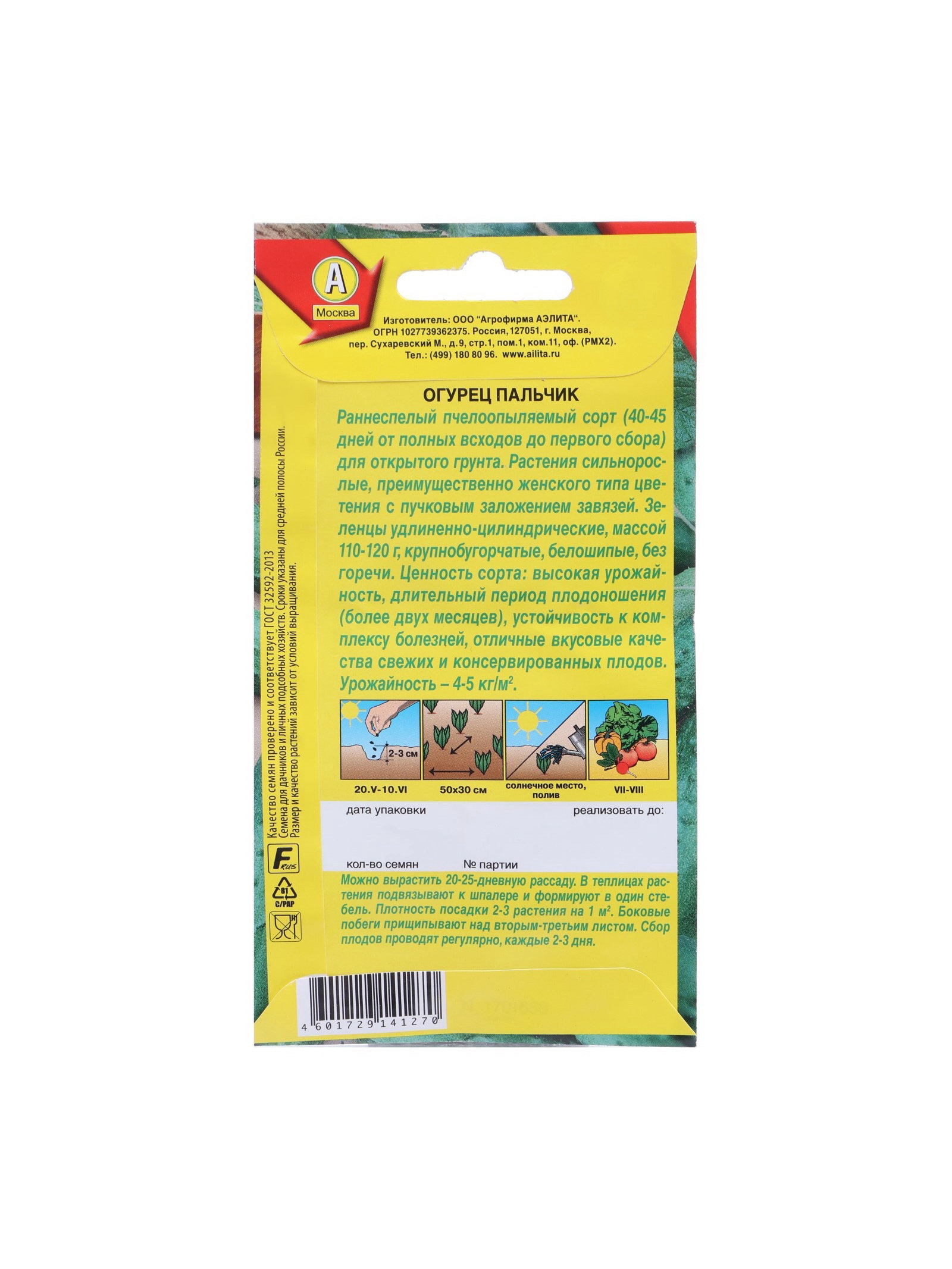 Семена Огурец Пальчик, раннеспелый, пчелоопыляемый, 10 шт, Агрофирма АЭЛИТА, Россия