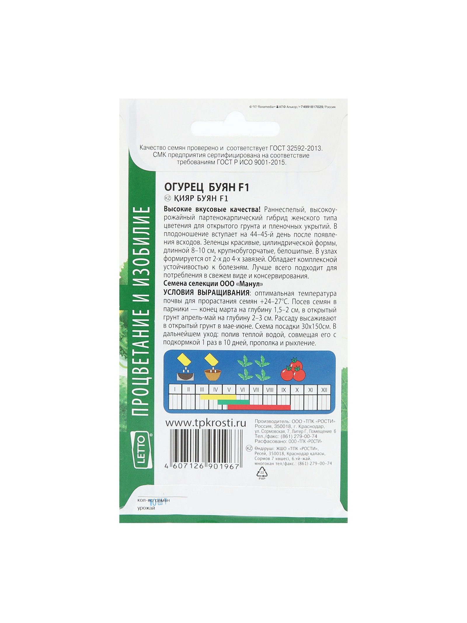 Семена Огурец Буян F1, партенокарпический, 8 шт, Агроуспех, РОССИЯ