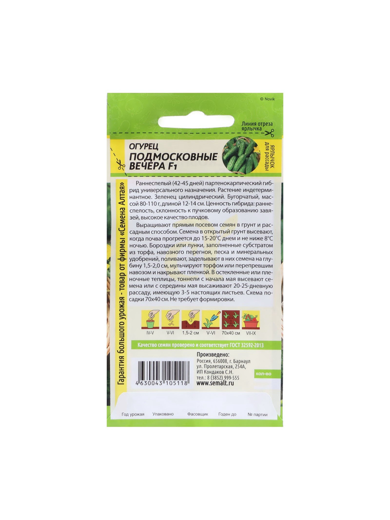 Семена Огурец "Подмосковные Вечера" F1, раннеспелый, партенокарпический, 5 шт, Семена Алтая, Россия