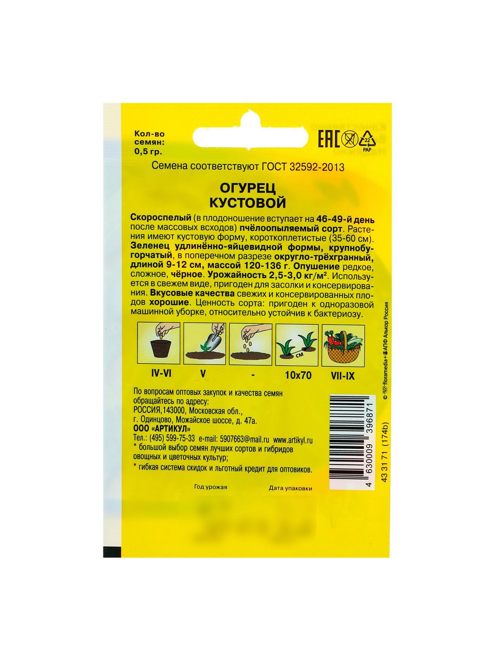 Семена Огурец "Кустовой" скороспелый, 0.5 г, Артикул, Россия