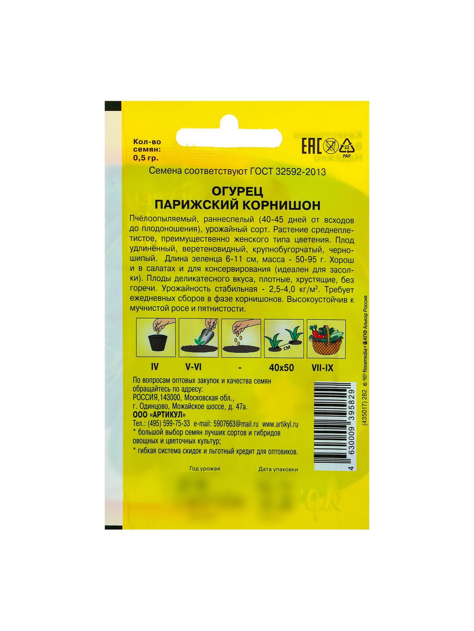 Семена Огурец "Парижский корнишон" раннеспелый, 0.5 г, Артикул, Россия